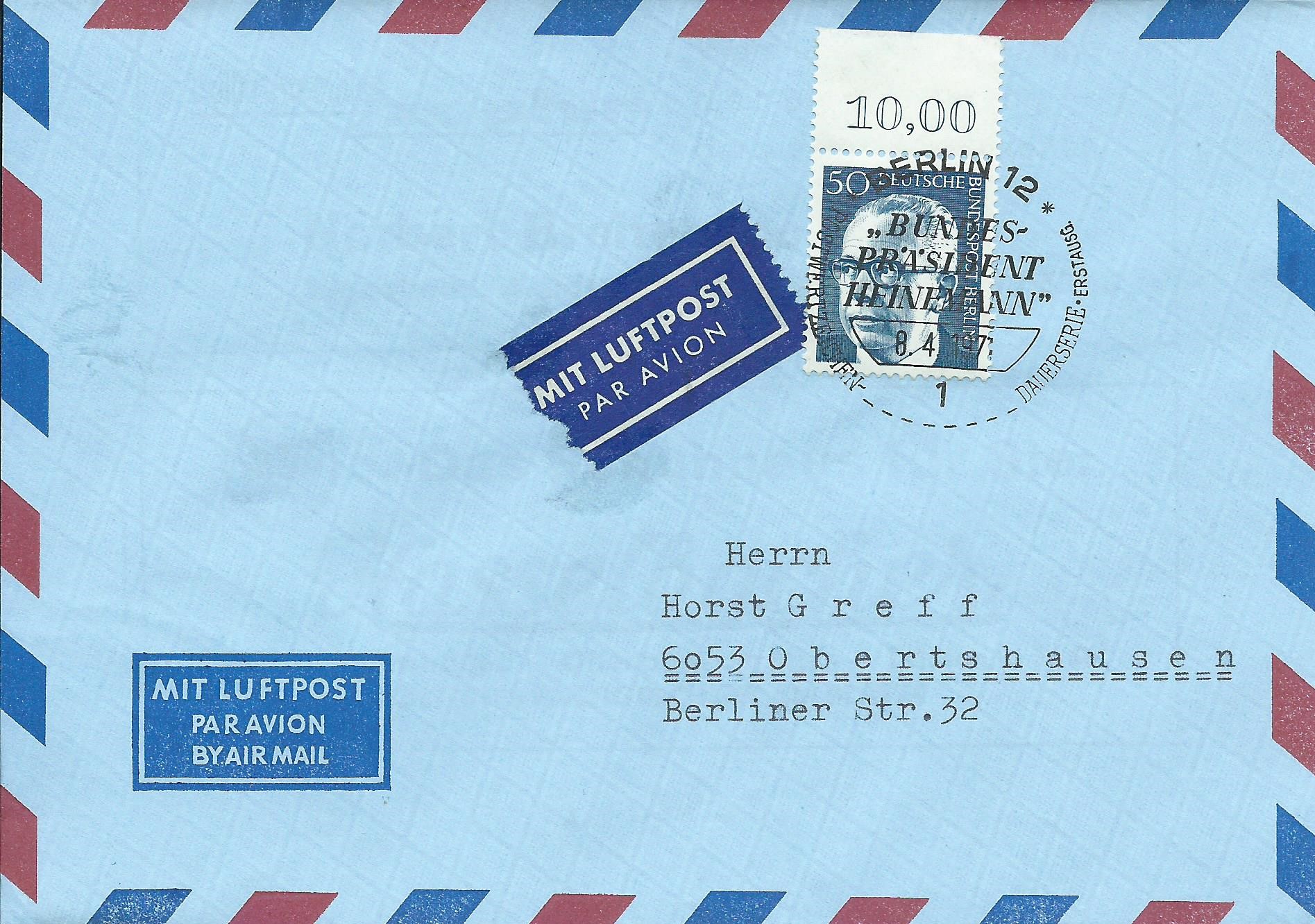 Der Wert zu 50 Pf vom Oberrand mit Reihenwertzähler 10,00 auf einem Luftpostbrief, gestempelt mit dem Ersttagssonderstempel Berlin am 8.4.71: