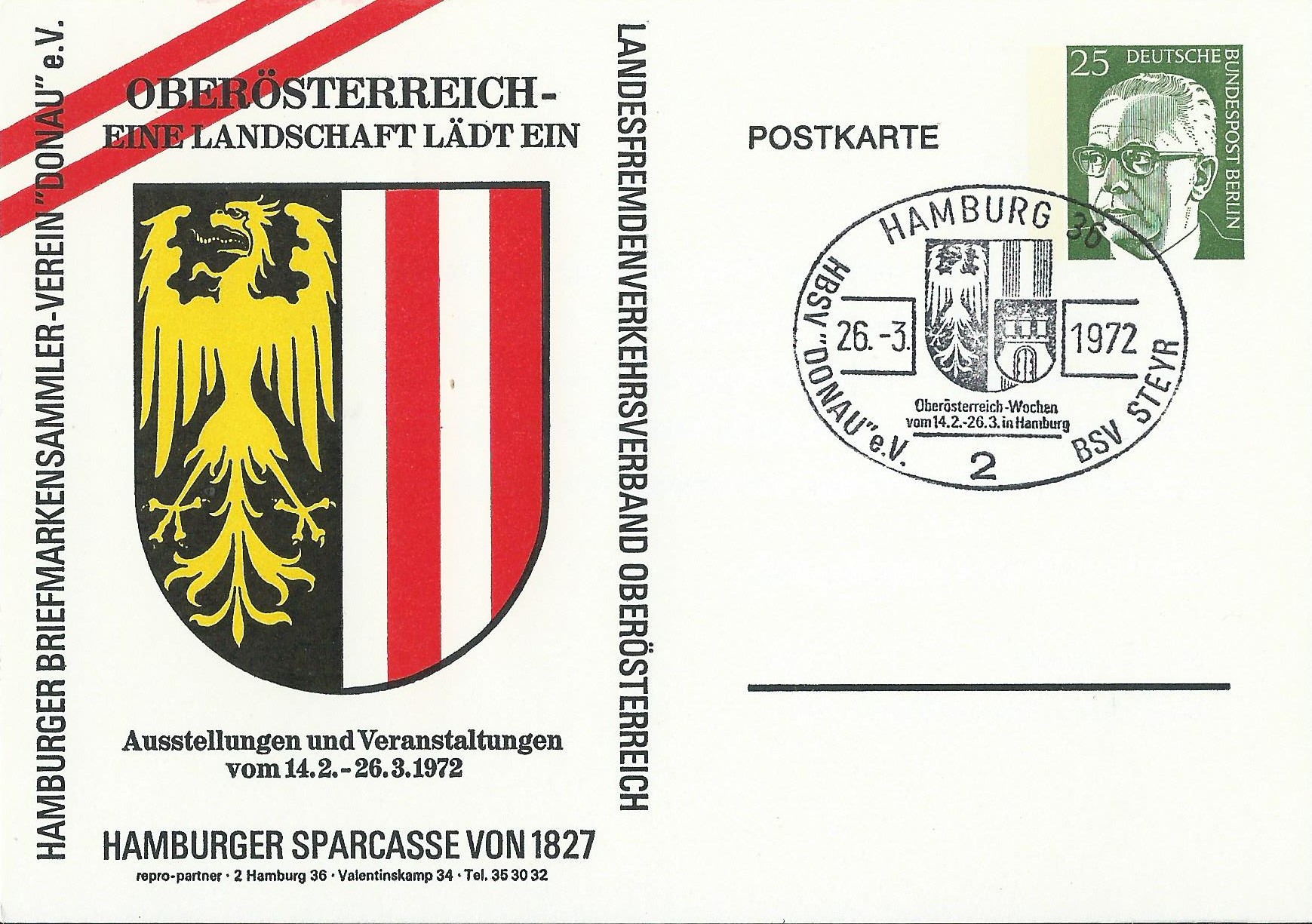 hier eine Ganzsache mit dem Wertstempel Heinemann zu 25 Pf. Im linken Feld ist ein Schmuckzudruck vom Hamburger Briefmarkensammler-Verein „Donau“ e. V., daher vermute ich mal, dass es sich um eine Privatganzsache handelt. Leider liegt mir der entsprechende Katalog nicht vor, so dass ich das nur raten kann. Gestempelt wurde mit dem passenden Veranstaltungs-Sonderstempel Hamburg am 26.3.72: