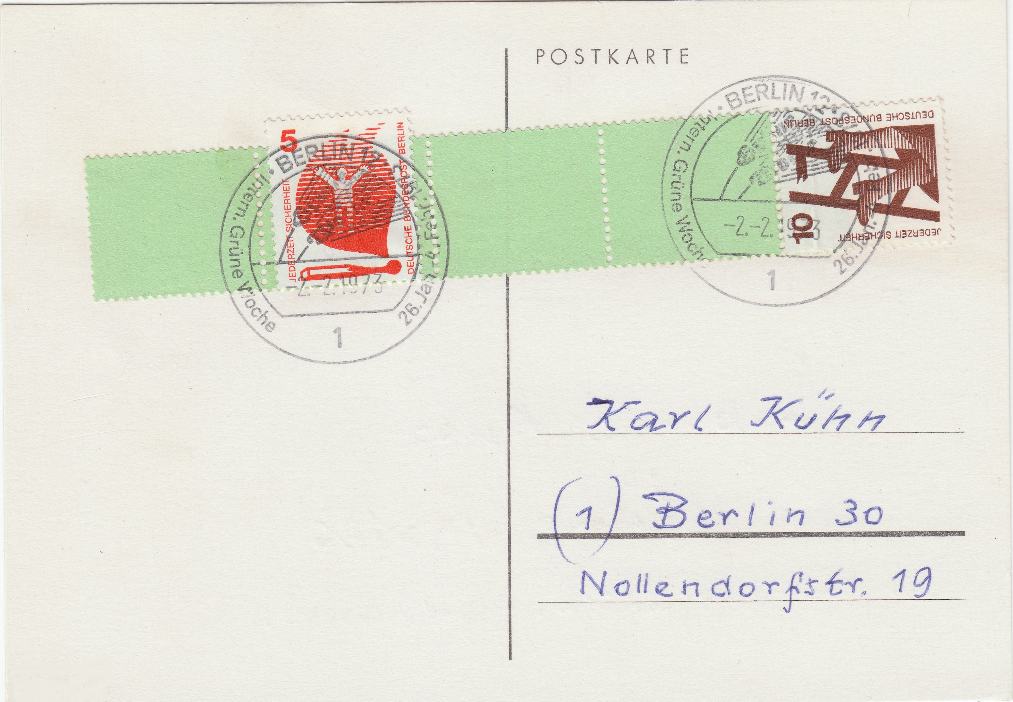 Hier ein solcher Beleg, portorichtig frankiert mit einem Rollenende RE 1+4 des 10 Pf Wertes der Dauerserie Unfallverhütung, Ausgabe Berlin, sowie einem 5 Pf Wert der Dauerserie Unfallverhütung, Ausgabe Berlin, entwertet am 02.02.1973 in BERLIN 12 per Sonderstempel "Grüne Woche":