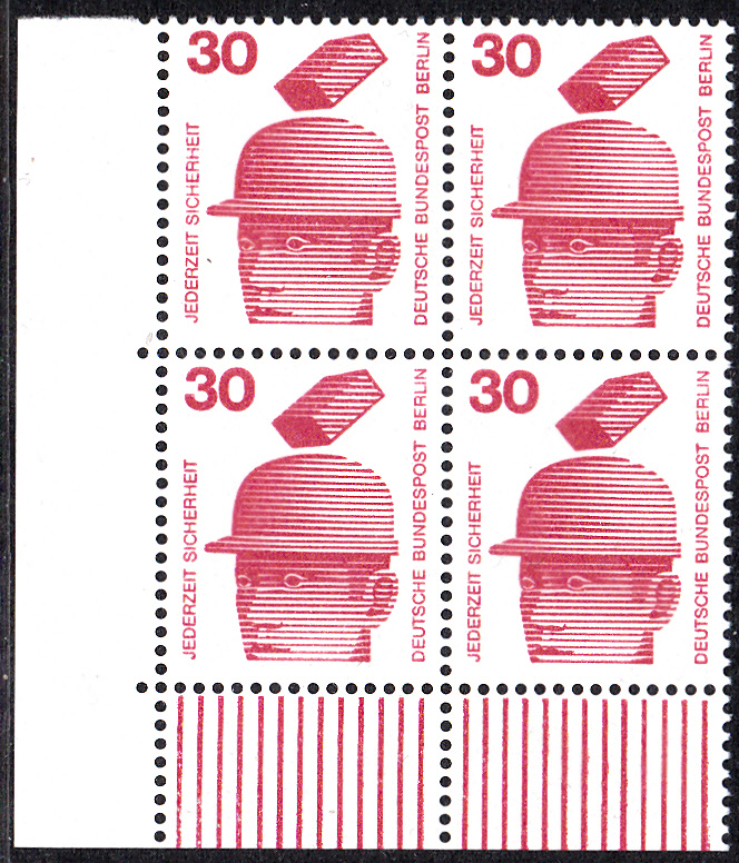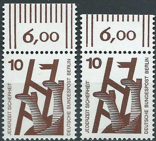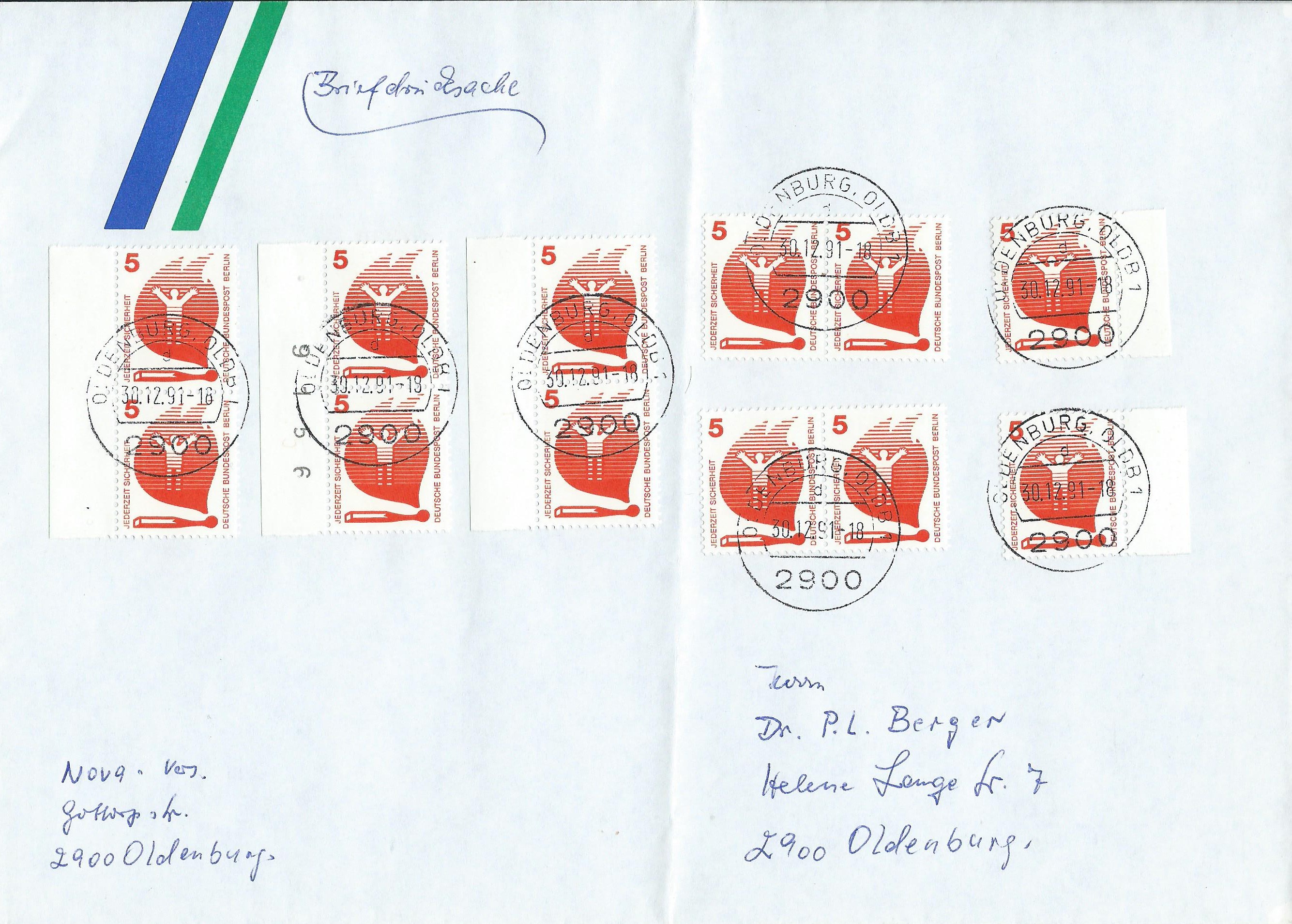 12 mal die Marke zu 5 Pf in verschiedenen Varianten auf einer Briefdrucksache. 3 mal senkrechtes Paar, wovon eines noch die Bogenzählnummer aufweist, 2 mal waagerechtes Paar und 2 Einzelmarken vom rechten Rand sehen wir hier. Gestempelt wurde der Beleg am 30.12.91 in Oldenburg in Oldenburg. (Das ist jetzt nicht doppelt gemoppelt mit dem Oldenburg, das heisst wirklich so! Es gibt noch ein weiteres Oldenburg in Holstein, daher die Unterscheidung.) Ich gehe mal davon aus, dass hier noch Restbestände der Marken verklebt wurden, da sie ja ab 1.1.92 nicht mehr frankaturgültig waren.