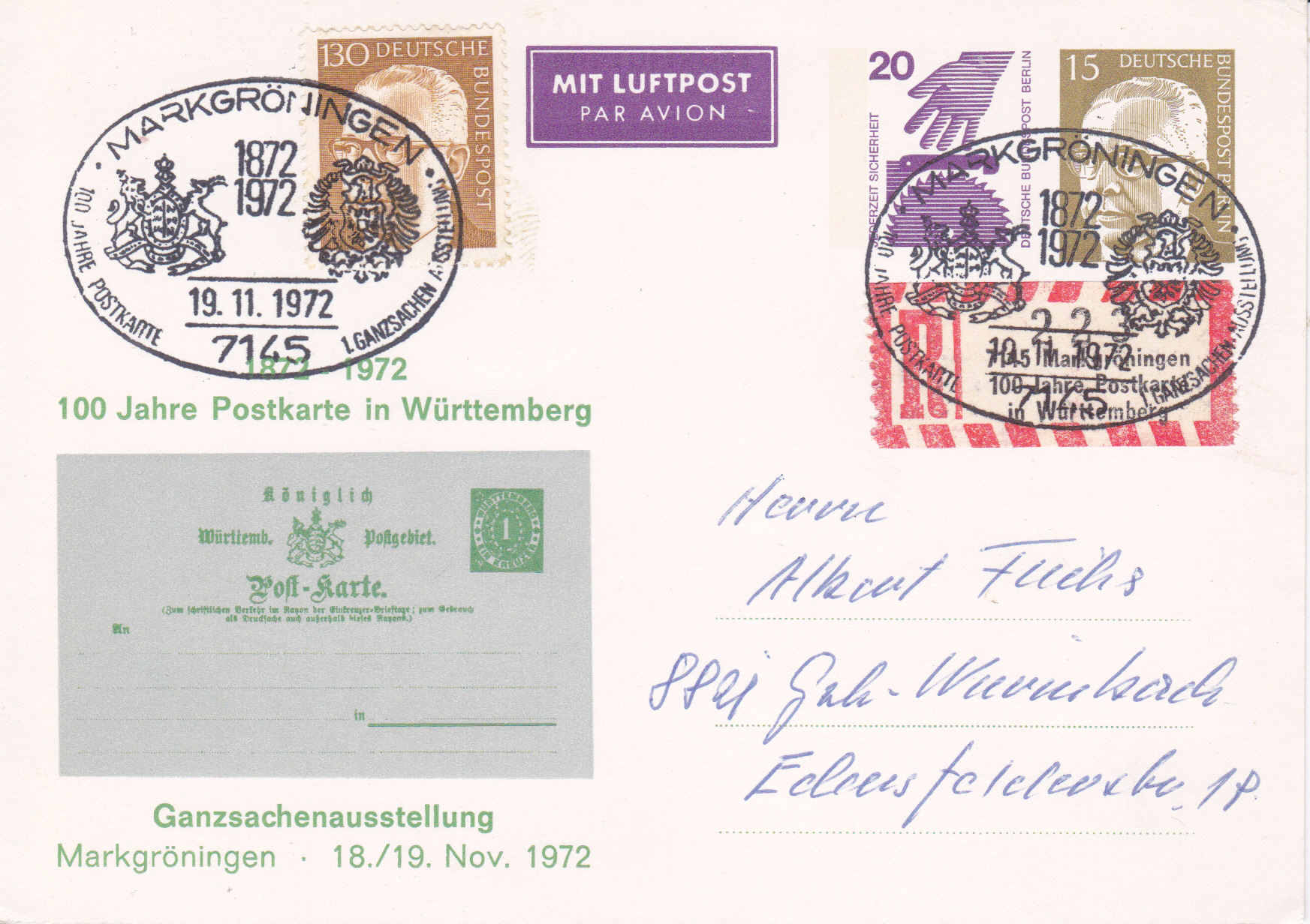 Privatpostkarte mit Luftpost mit den Wertstempel einer 15Pf Marke Berlin der Serie Gustav Heinemann und einer Marke Berlin zu 20Pf der Serie Unfallverhütung und Zusatzfrankatur einer Marke Bund zu 130Pf aus der Serie Gustav Heinemann (MiNr 728) verschickt als Einschreiben mit einem Sonderstempel aus Markgröningen vom 19.11.1972 und einem Sonder-E-Zettel "100 Jahre Postkarten".