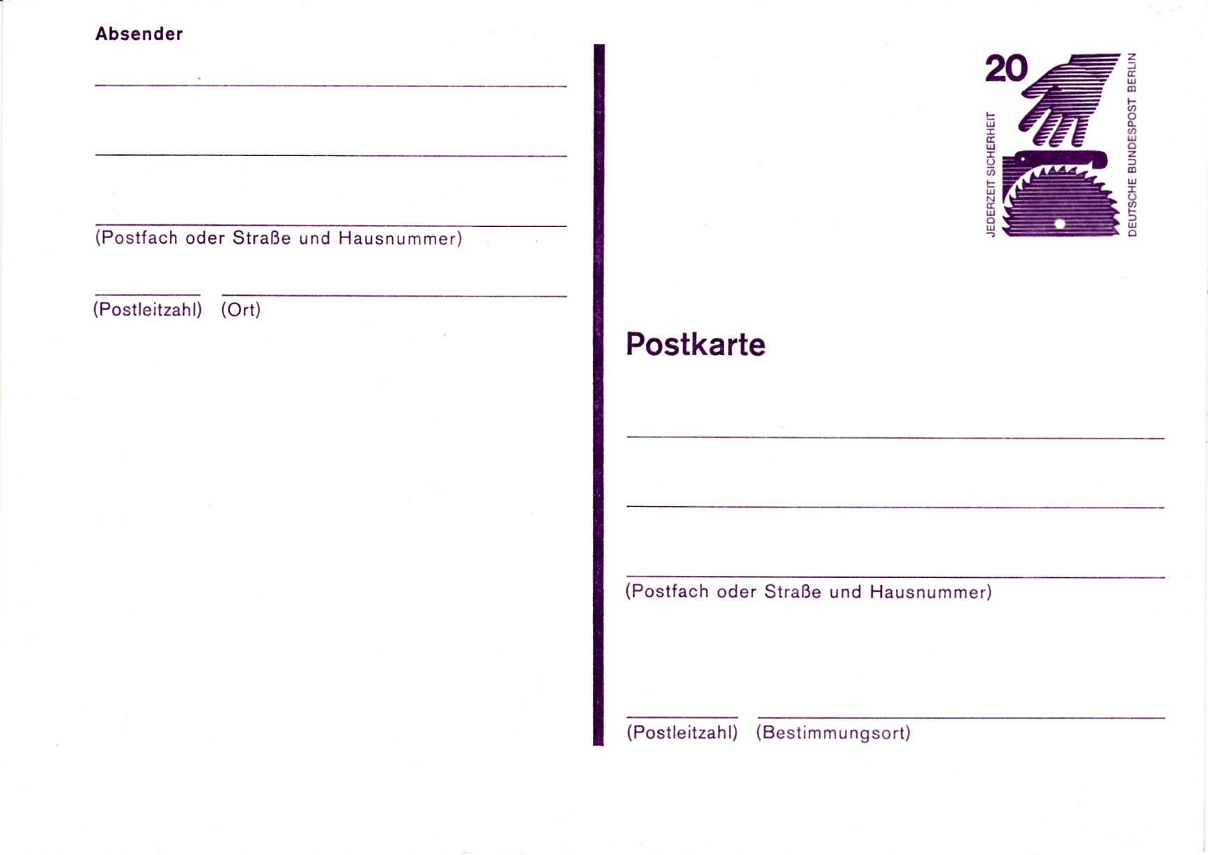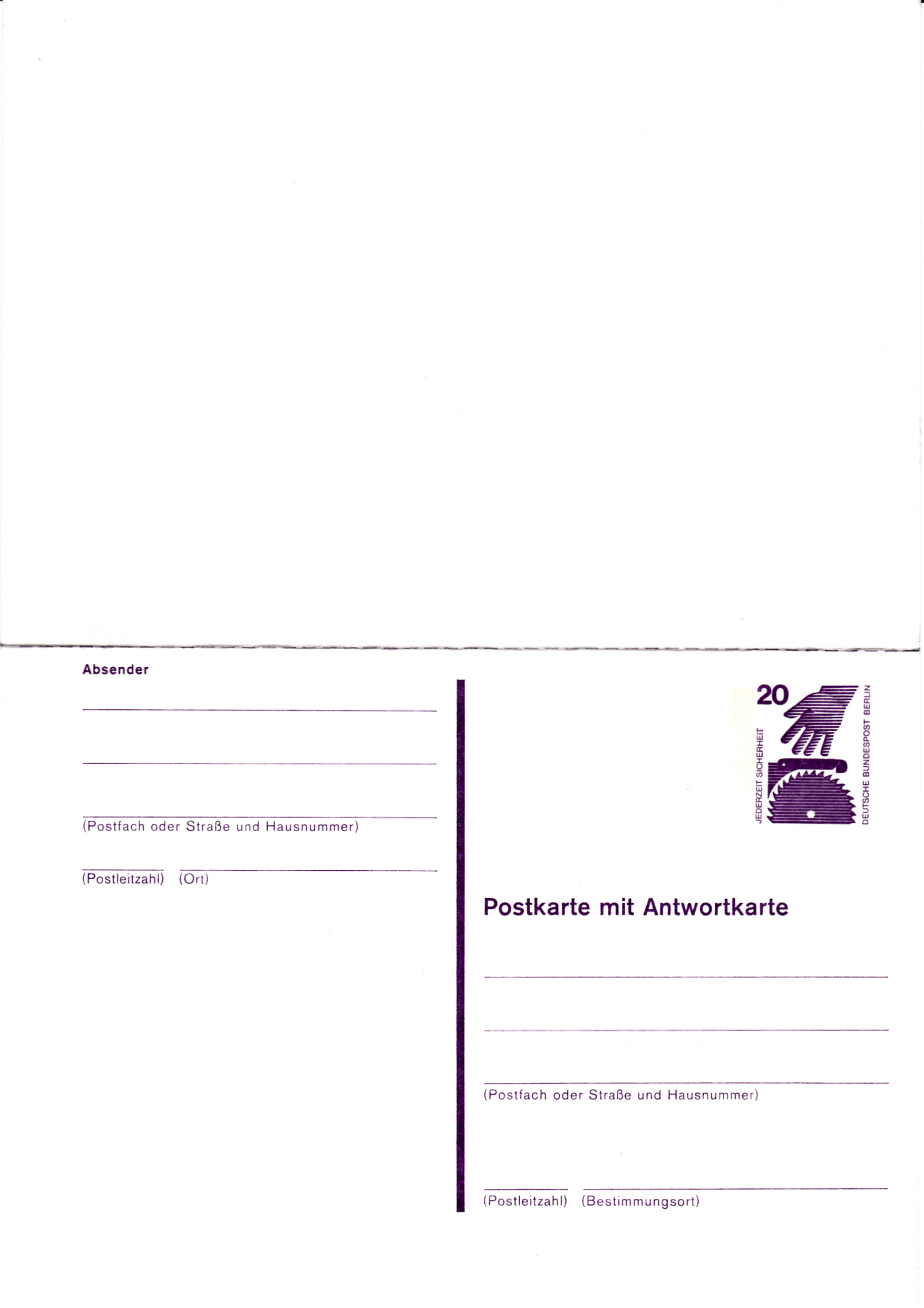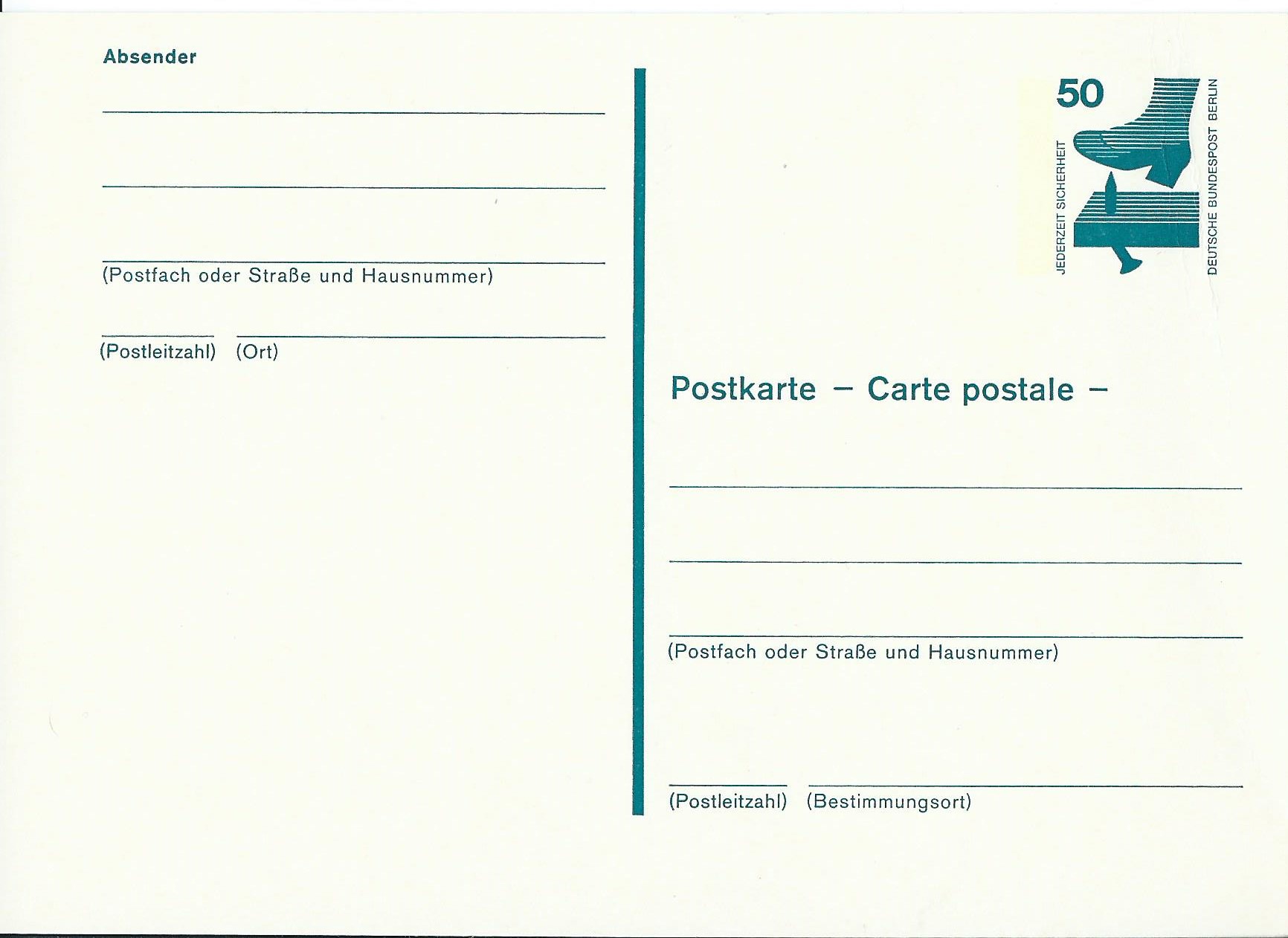 von der Serie Unfallverhütung sind auch Ganzsachen mit eingedruckten Markenmotiven erschienen. Hier kann ich eine ungebrauchte Postkarte zu 50 Pf (MiNr P 100) mit dem entsprechenden Wertstempel zeigen. Da der zusätzliche Vermerk „Carte postale“ mit aufgedruckt wurde, war sie für den Auslandsverkehr vorgesehen.