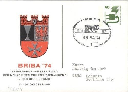 Privatganzsachen-Postkarte mit Wertstempel zu 40Pf (Defekter Stecker) zur Briefmarkenausstellung BRIBA'74 mit dem dazu passenden Sonderstempel vom 19.10.1974.