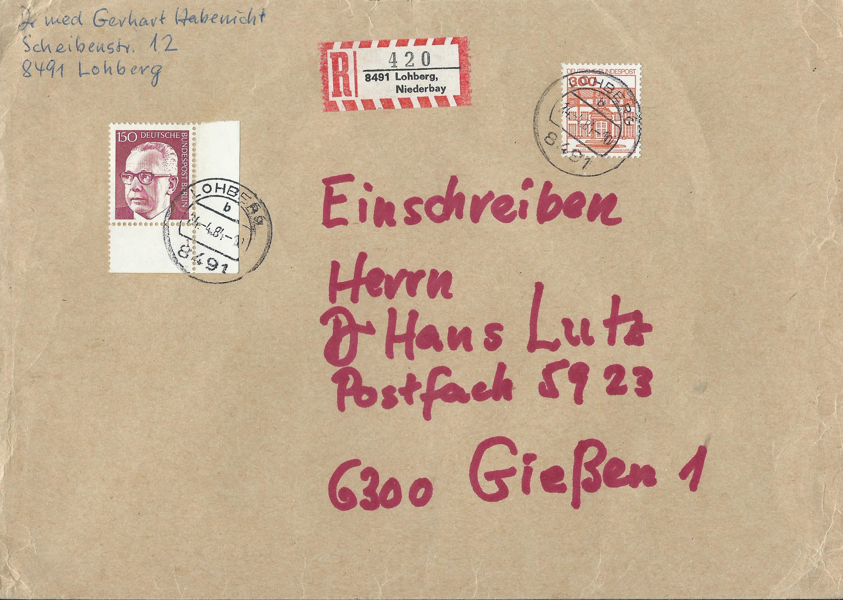 Nochmal der Wert zu 150 Pf, dieses Mal aus der rechten unteren Bogenecke mit Formnummer 1 nebst einer weiteren Marke Burgen und Schlösser zu 300 Pf als Einschreiben, gestempelt am 24.4.84 in Lohberg: