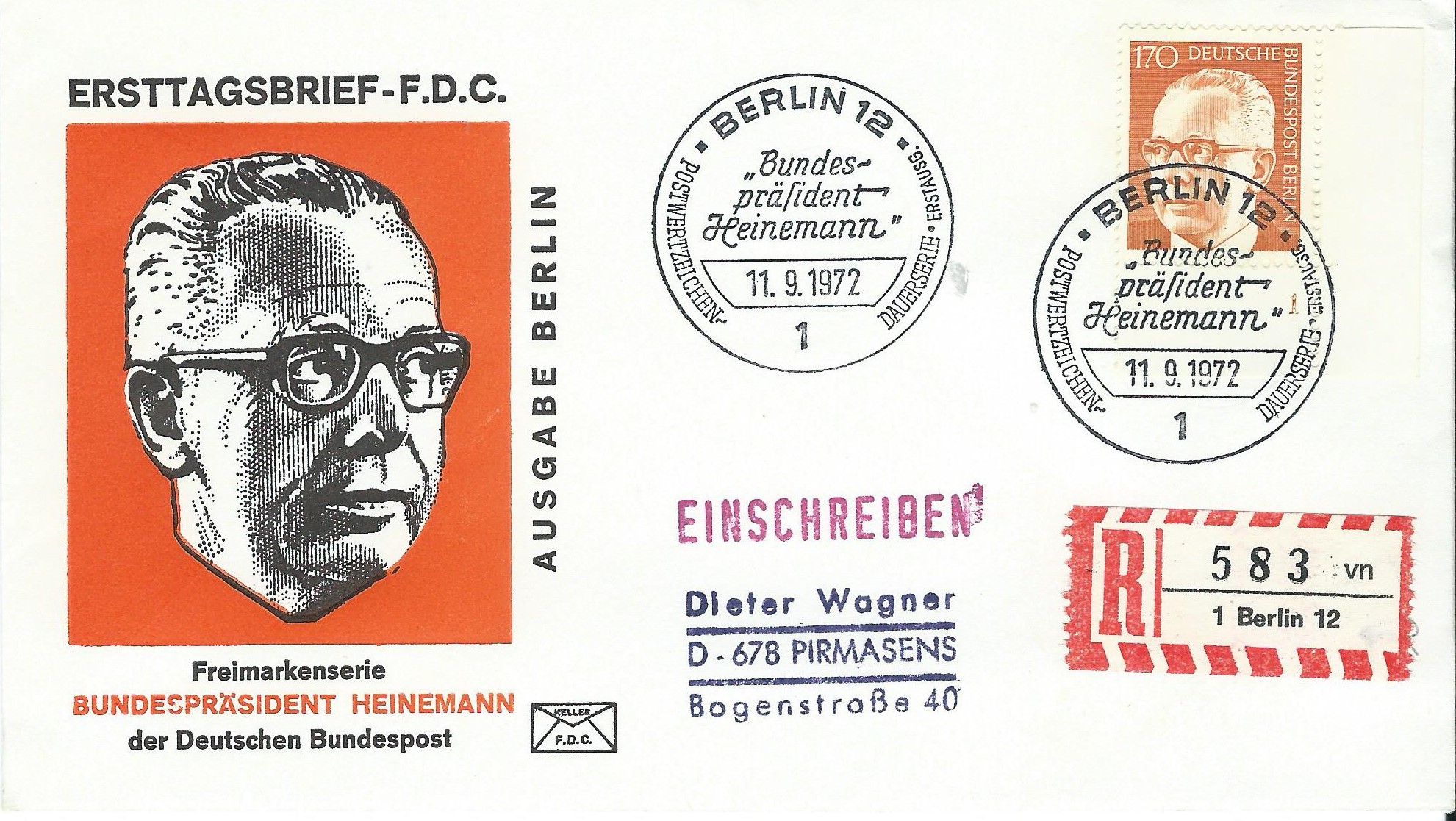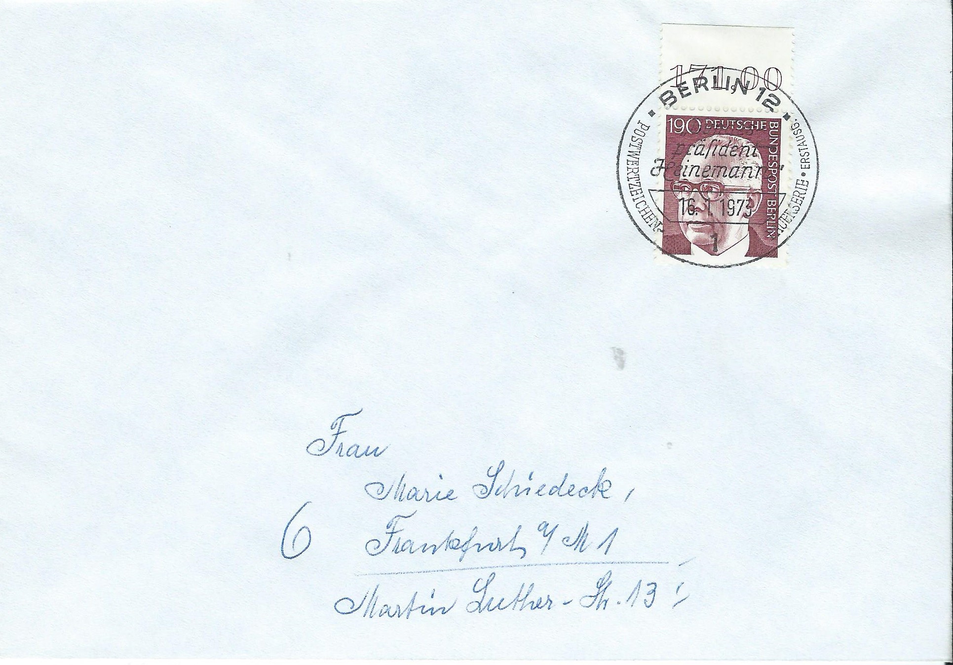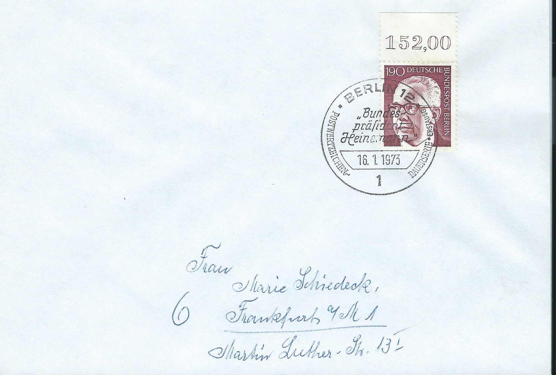 Auf diesem Brief von 21 bis 50 Gramm wurden am 19.1.11976die Marken zu 5Pf, 10Pf, 20Pf, 30Pf aus einer früheren Ausgabe und die zu 15Pf zusammen verklebt, um die 80Pf Porto für diese Gewichtsstufe zu bezahlen.