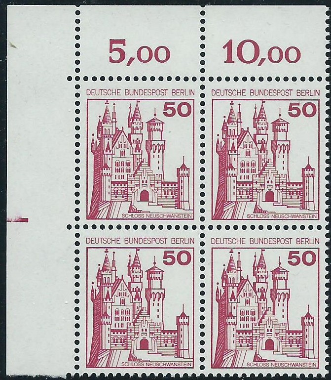 Der Wert zu 10 Pf als postfrischer 4-er-Block aus der linken oberen Bogenecke mit Plattenzeichen in Form eines Kreises in Markenfarbe: