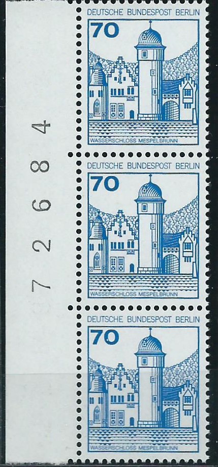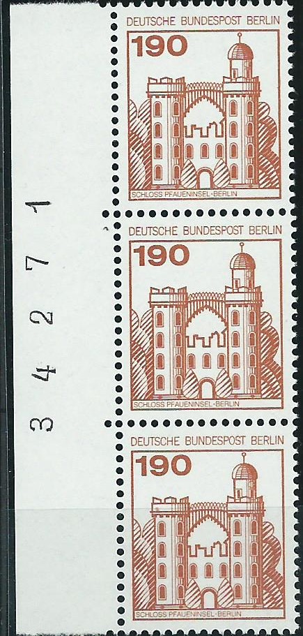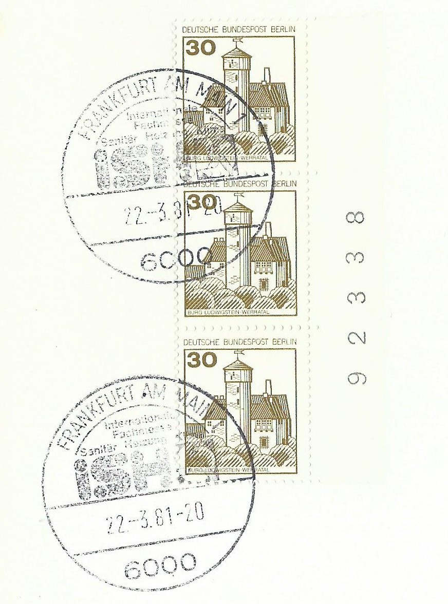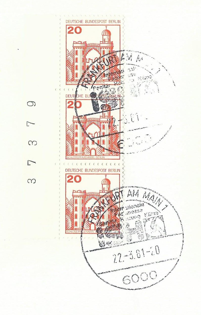 Der Wert zu 10 Pf vom linken Bogenrand als senkrechter 3-er-Streifen mit Bogenzählnummer auf einem Briefausschnitt, gestempelt mit einem Sonderstempel von Frankfurt am Main vom 22.3.81: