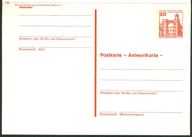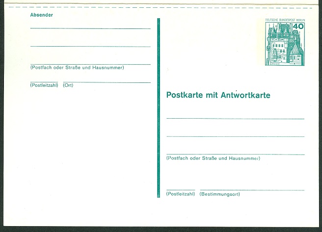 Hier noch eine Ortspostkarte Berlin MiNr P108, die allerdings mit einer Zusatzfrankatur im Bundesgebiet verschickt wurde.
