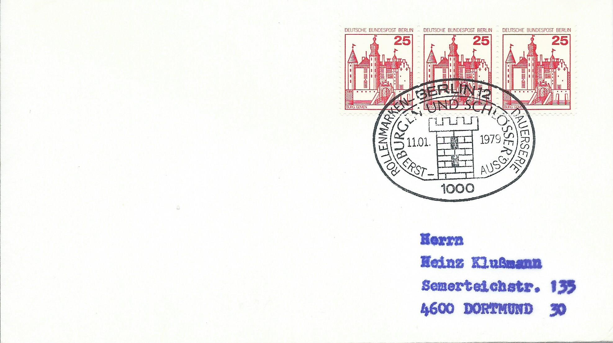 Den Anfang macht ein Beleg mit einem waagerechten 3-er-Streifen. Der ist zwar von Portorichtig ganz weit weg, aber trotzdem durch den Ersttagsstempel von Berlin vom 11.1.79 ein Ersttagsbrief.