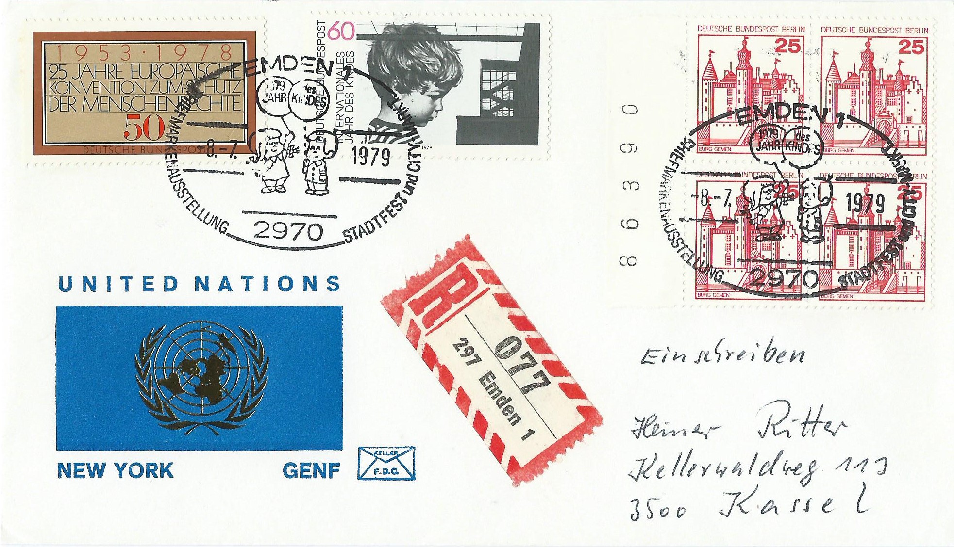 Dazu gesellt sich ein Einschreiben mit einer bunten Frankatur und einem 4-er-Block vom linken Rand, auf dem auch noch die Bogenzählnummer vorhanden ist. Gestempelt wurde mit einem Sonderstempel aus Emden am 8.7.79.