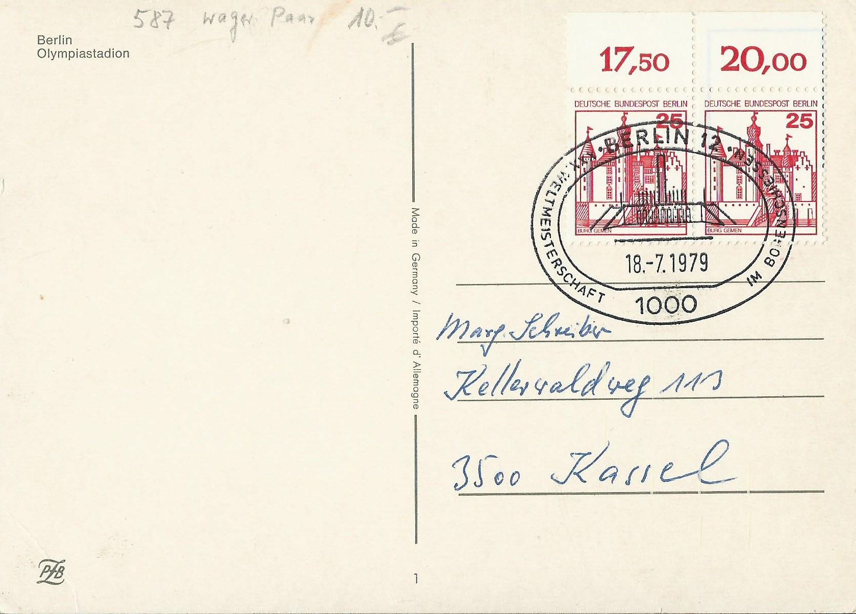 Hier haben wir eine Postkarte mit einem waagerechten Paar vom Oberrand mit den entsprechenden Reihenwertzählern. Die Karte ist somit portorichtig frankiert und am 18.7.79 in Berlin mit einem Sonderstempel entwertet worden.