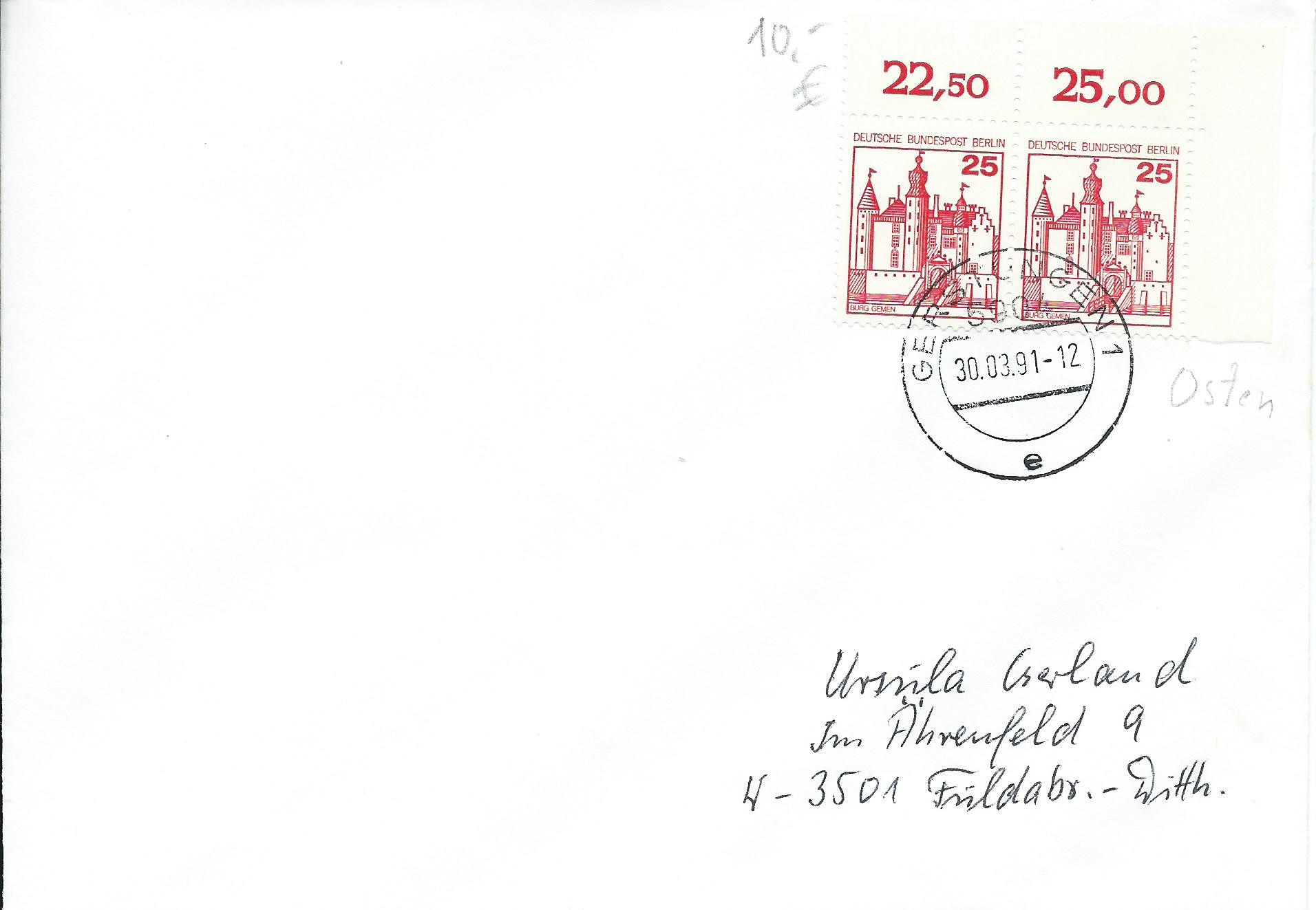 Und noch eine Verwendung aus dem Verkehrsgebiet Ost (ehemalige DDR): Ein waagerechtes Paar aus der rechten oberen Bogenecke mit Tagesstempel Gerstungen vom 30.3.91. Das war ein Samstag und somit die letzte Gelegenheit, das alte „Ost-Porto“ am Schalter gestempelt zu dokumentieren. Ab dem 1.4.91 (zwar ein Montag, aber Ostern!) galt auch in der ehemaligen DDR das Porto der Bundesrepublik, für einen Standartbrief also 1 DM.
