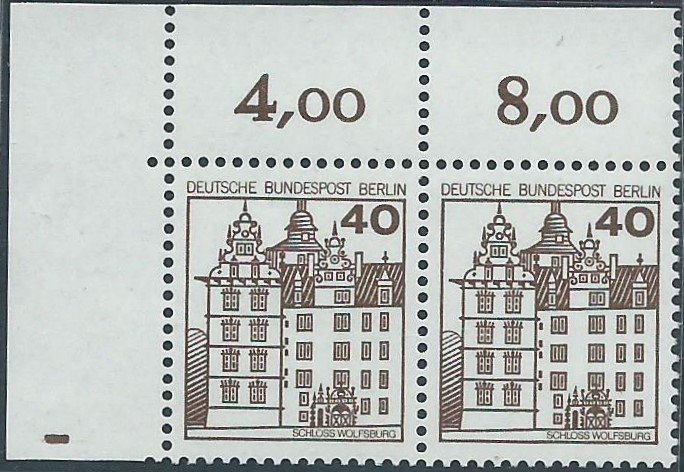 der Wert zu 40 Pf vom Oberrand mit Reihenwertzähler 8,00 und Teil vom Ersttagssonderstempel: