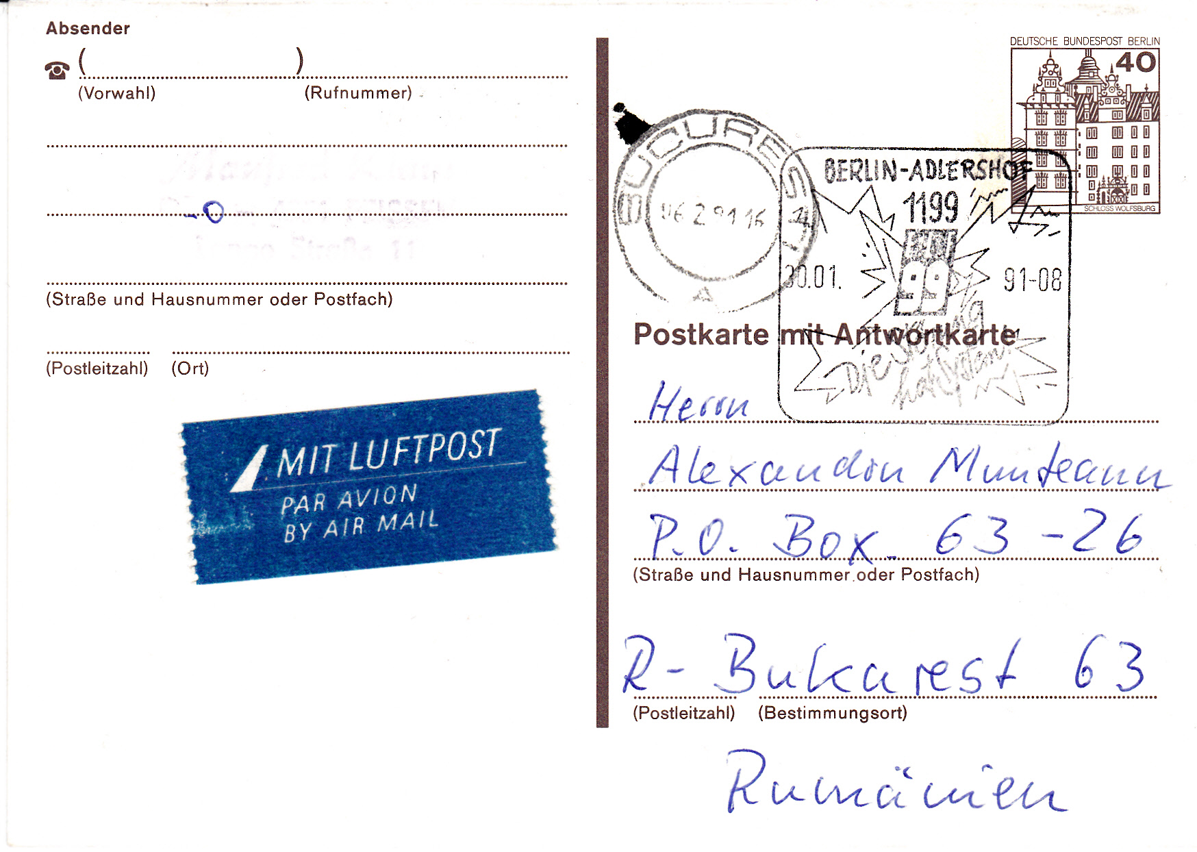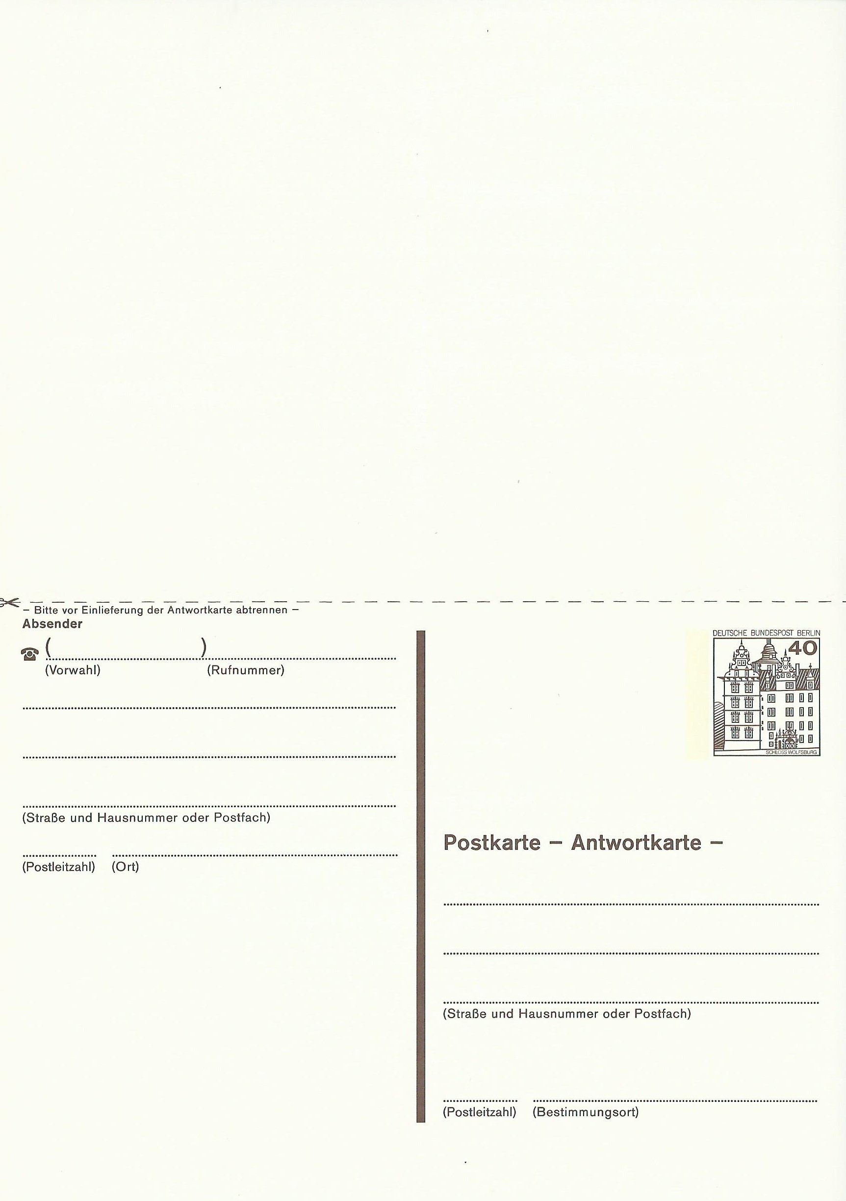 Postkarte mit Antwortkarte - Frageteil Ortstarif mit Wertstempel zu 40Pf Renaissanceschloss Wolfsburg (MiNr P 124 F II) im Letterset. Die Postkarte wurde erst 1991 aus dem VGO nach Rumänien verschickt. Das Porto betrug im VGO für eine Postkarte nach Rumänien 30Pf wie im Inland und der Luftpostzuschlag war 10Pf, zusammen also portogerecht zu 40Pf verschickt.