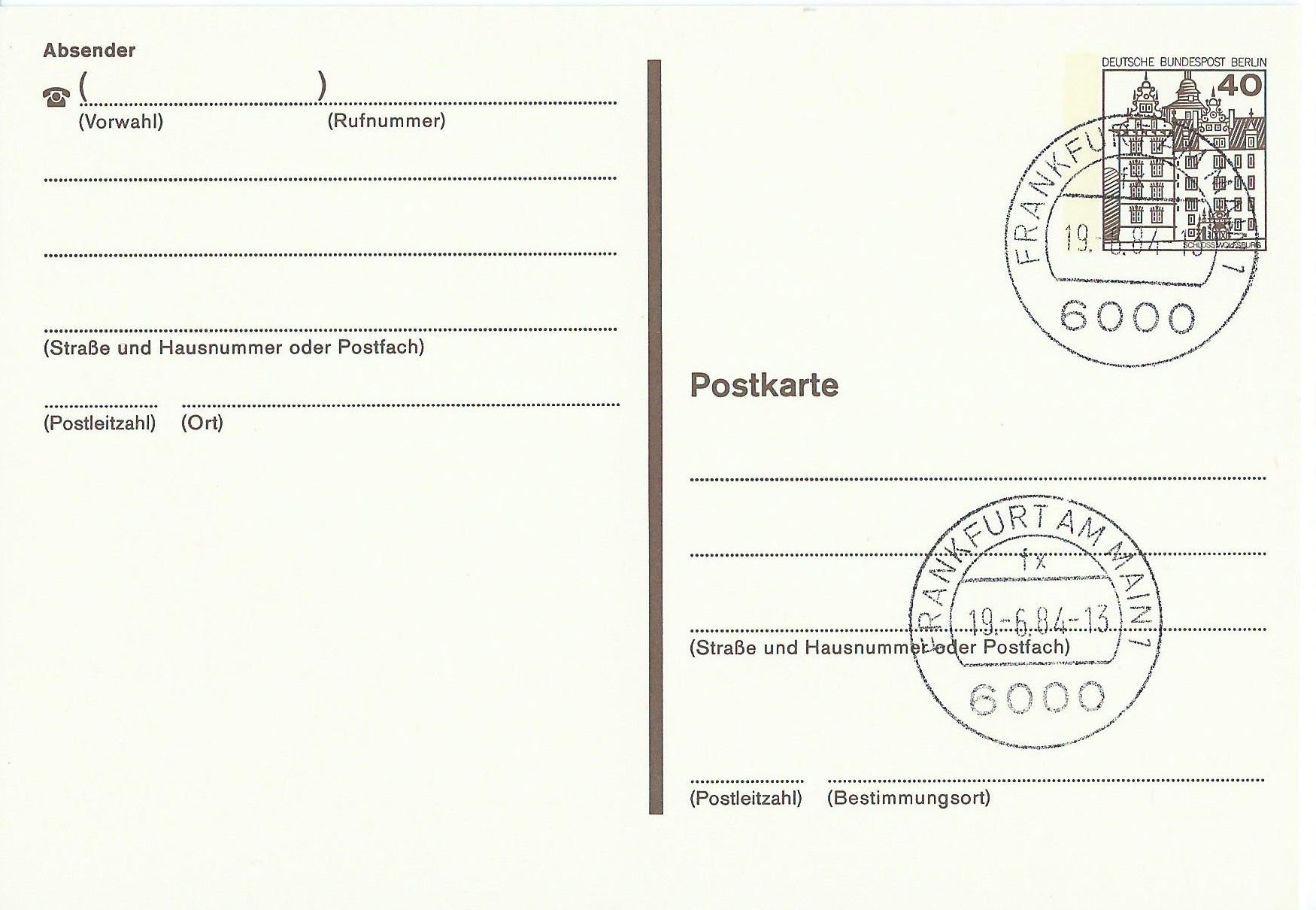 Eine Postkarte zu 40 Pf mit Stempel Frankfurt am Main vom19.6.84: