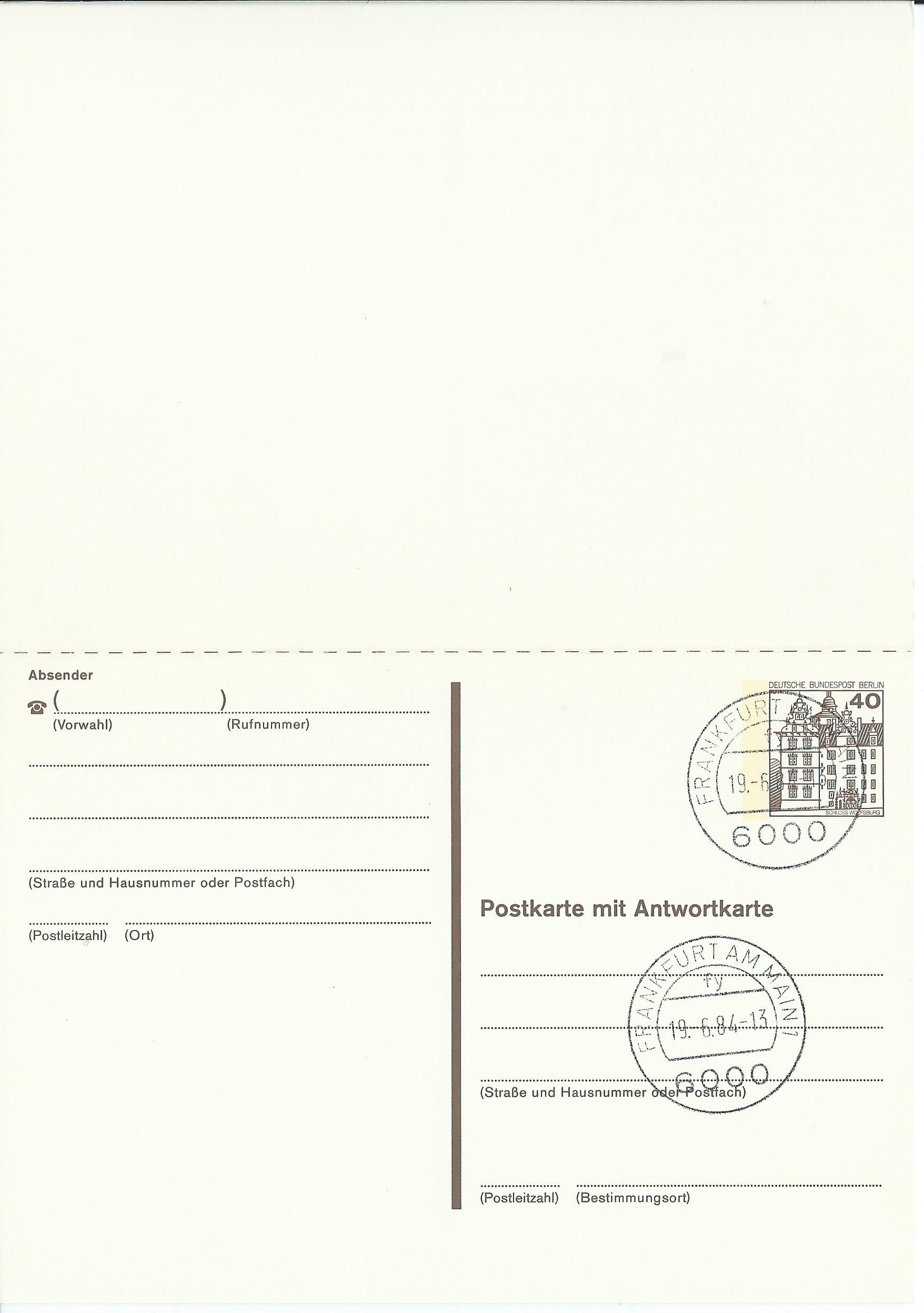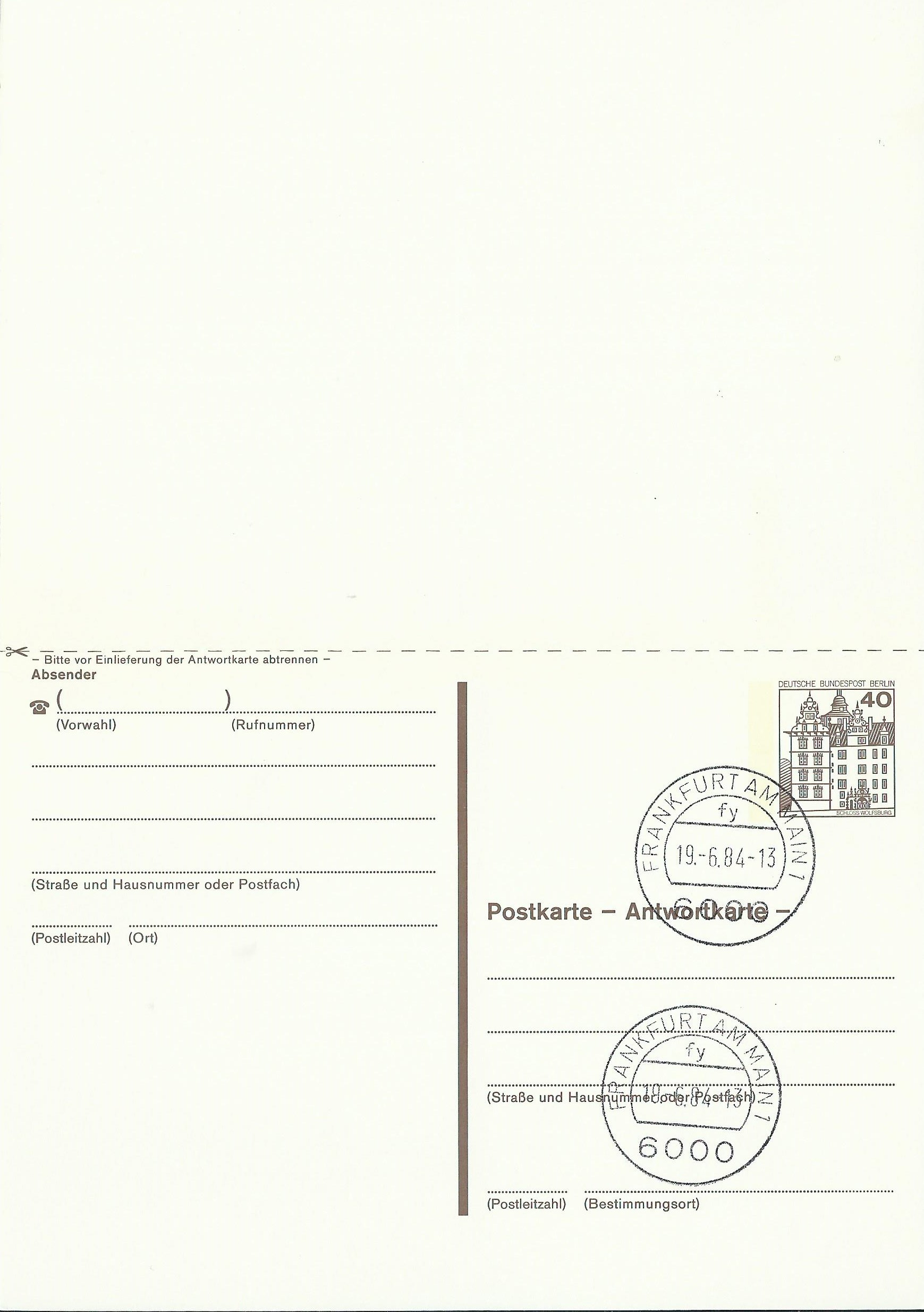 Dazu eine Postkarte mit Antwortkarte zu 40 Pf mit Stempel Frankfurt am Main vom 19.6.84: