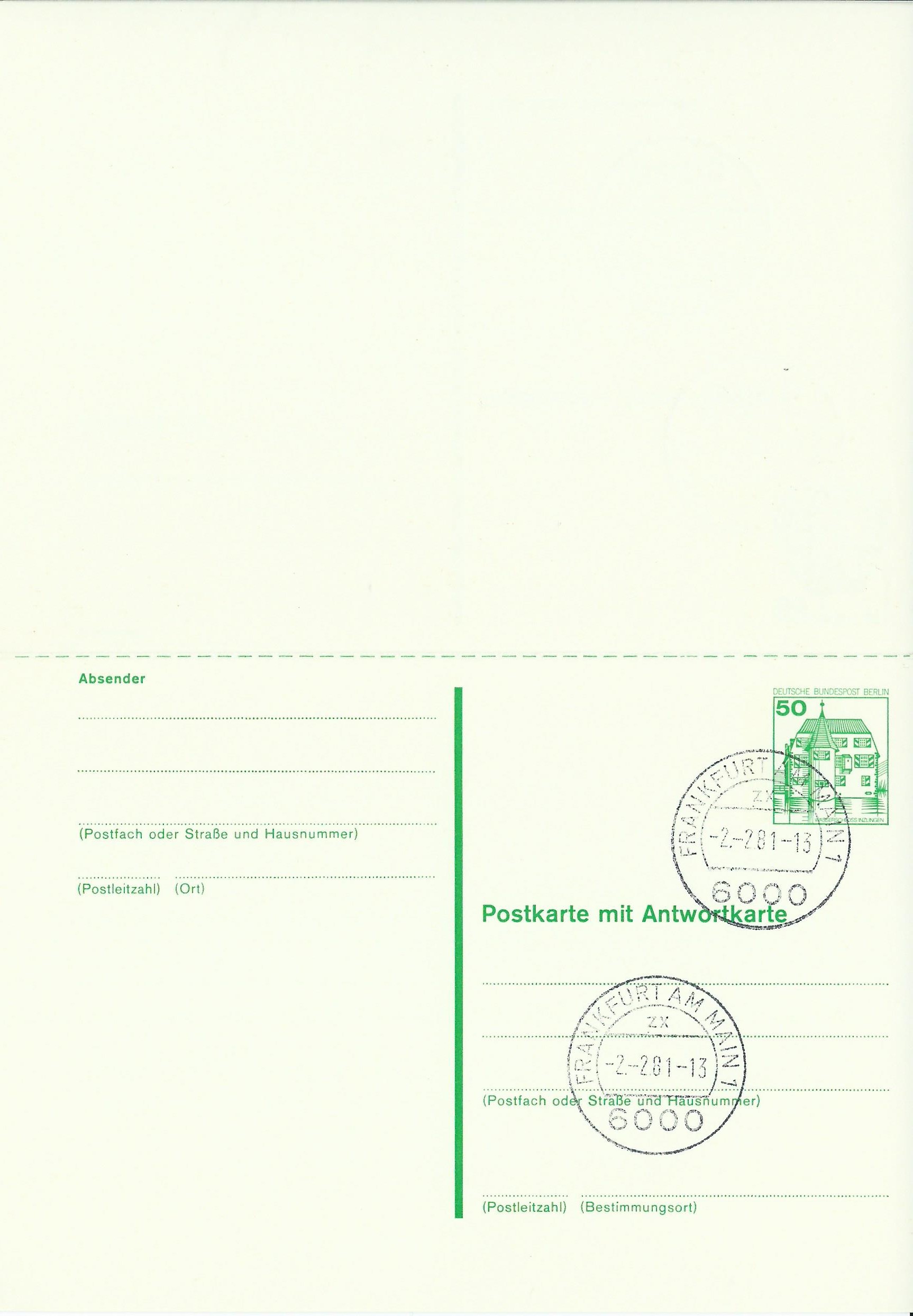 Dazu eine Postkarte mit Antwortkarte zu 50 Pf mit Stempel Frankfurt am Main vom 16.1.81: