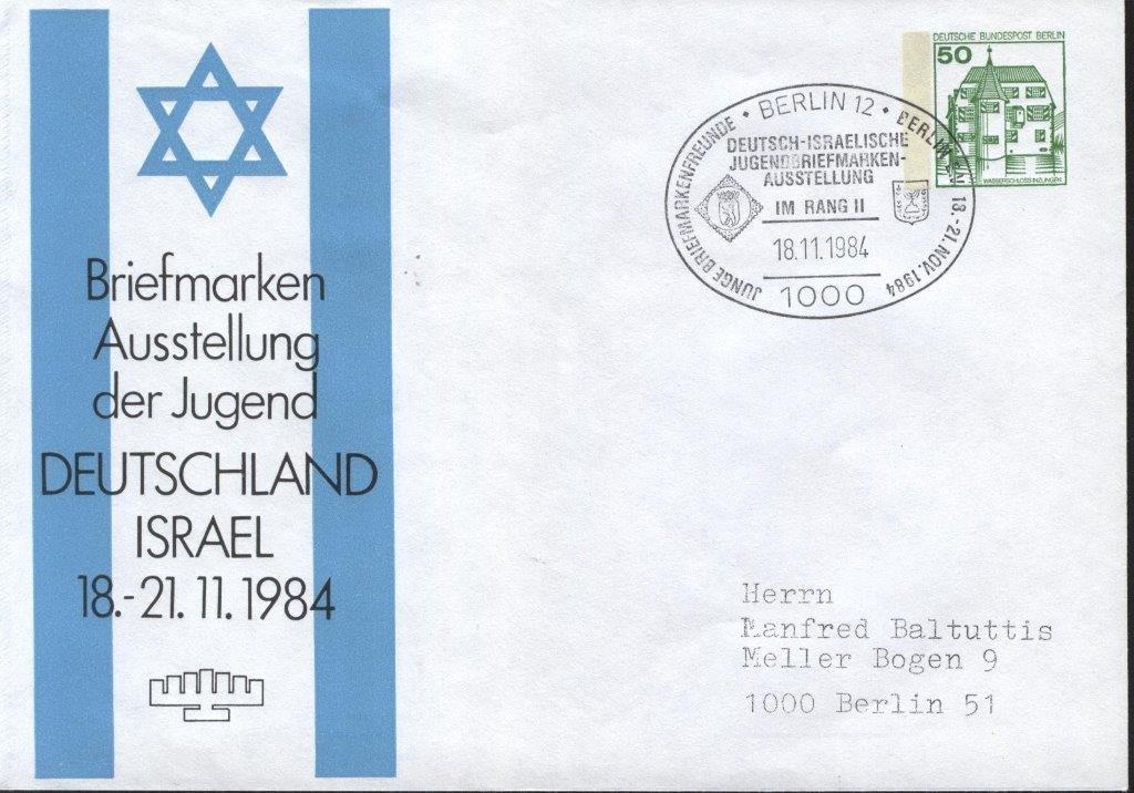 Diese Privatganzsache zur Deutsch-Israelischen Briefmarken-Ausstellung der Jugend im Jüdischen Gemeindehaus in Berlin wurde mit dem dazu passenden Sonderstempel vom 18.11.1984 gestempelt.
