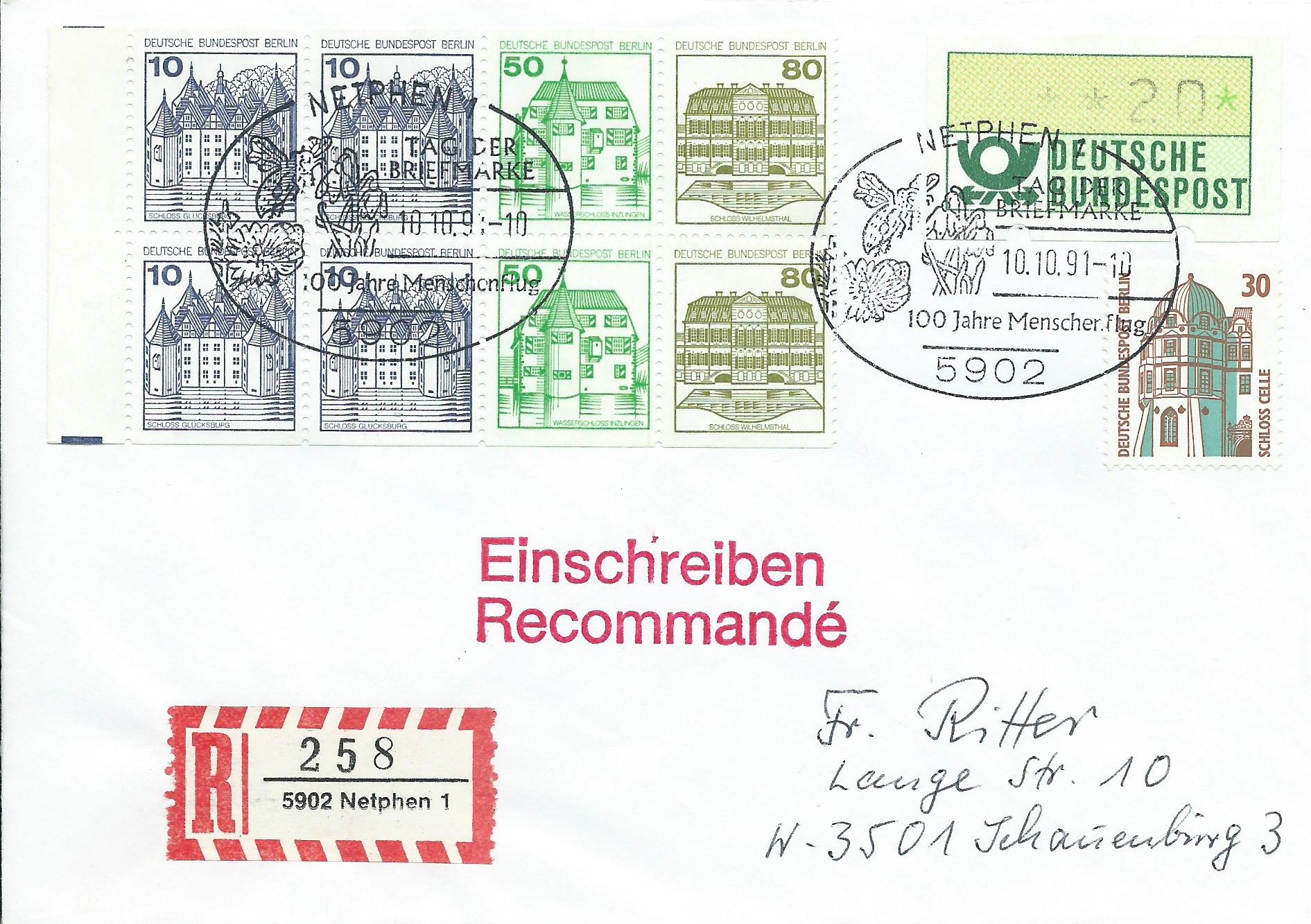 Den Anfang macht ein komplettes Heftchenblatt (sogar mit Rand!) auf einem Einschreibbrief mit einer Zusatzfrankatur einer Marke SWK 30 Pf Berlin und einer Automatenmarke 20 Pf Bund. Gestempelt wurde mit einem Sonderstempel aus Netphen am 10.10.91.