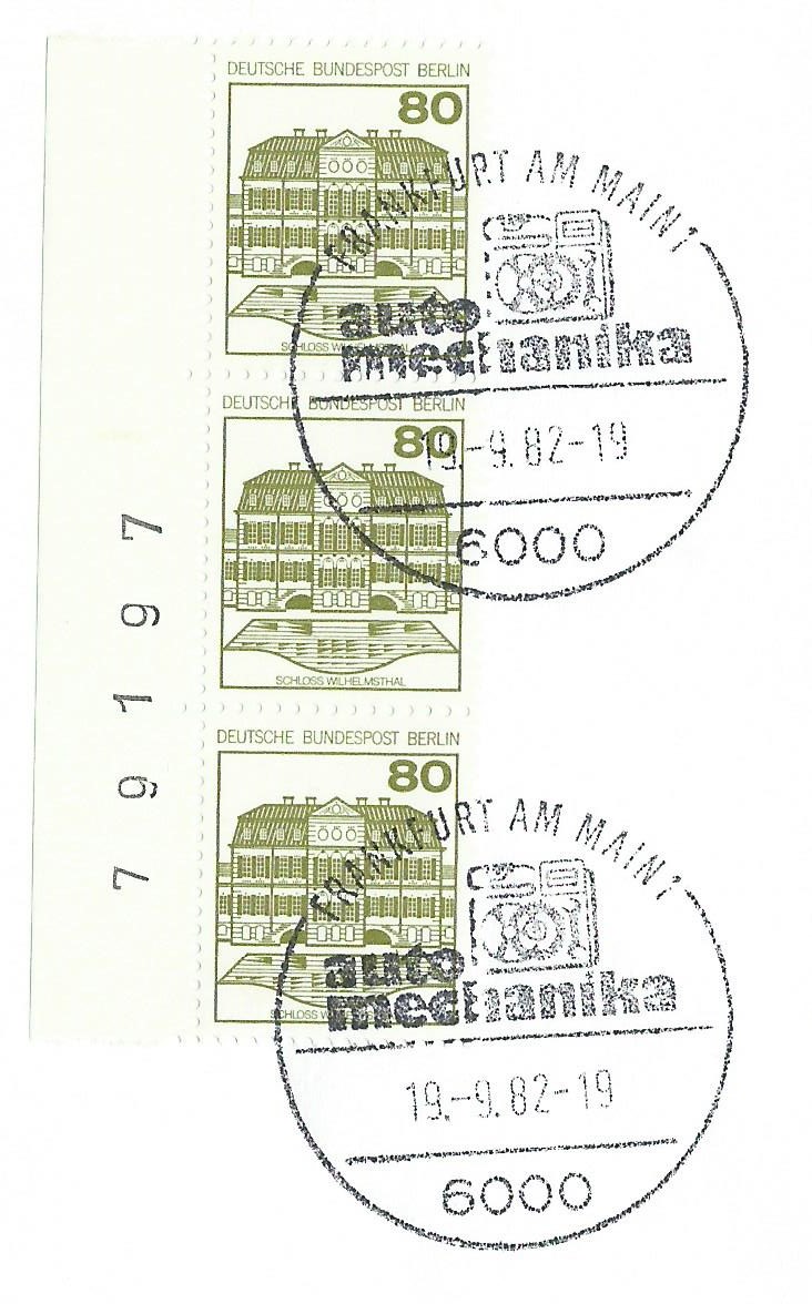 Der Wert zu 80 Pf vom linken Bogenrand als senkrechter 3-er-Streifen mit Bogenzählnummer auf einem Briefausschnitt, gestempelt mit einem Sonderstempel von Frankfurt am Main vom 22.3.81: