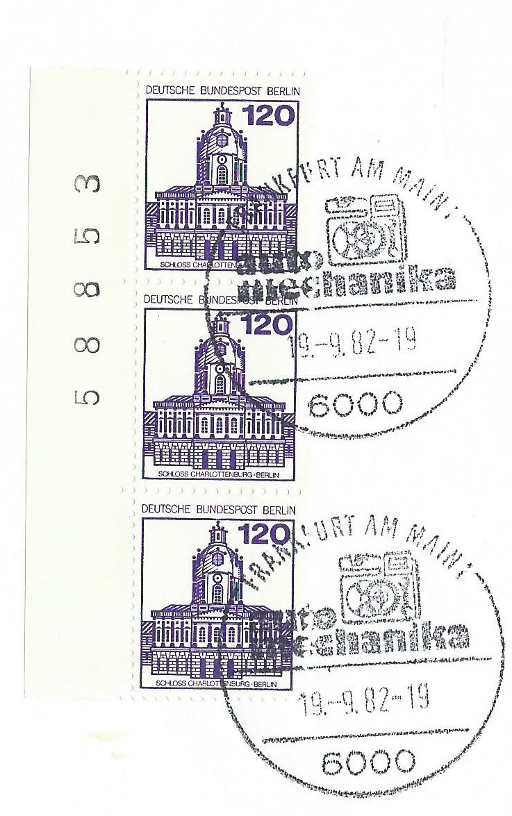 Der Wert zu 120 Pf vom linken Bogenrand als senkrechter 3-er-Streifen mit Bogenzählnummer auf einem Briefausschnitt, gestempelt mit einem Sonderstempel von Frankfurt am Main vom 22.3.81: