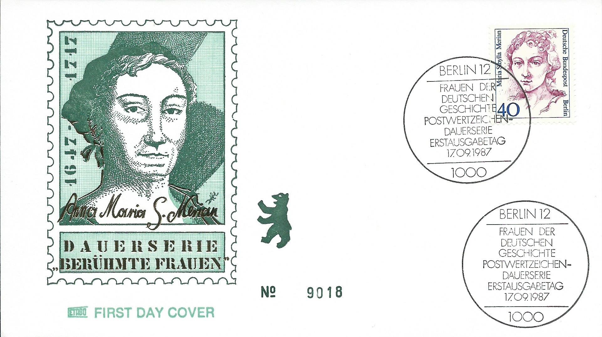 am 17.9.87 erschien die Marke der Dauerserie Frauen der Deutschen Geschichte mit der Wertstufe zu 40 Pf Maria Sibylla Merian. Hier wird sie auf einem Ersttagsbrief zusammen mit dem passenden Berliner Ersttagsstempel präsentiert: