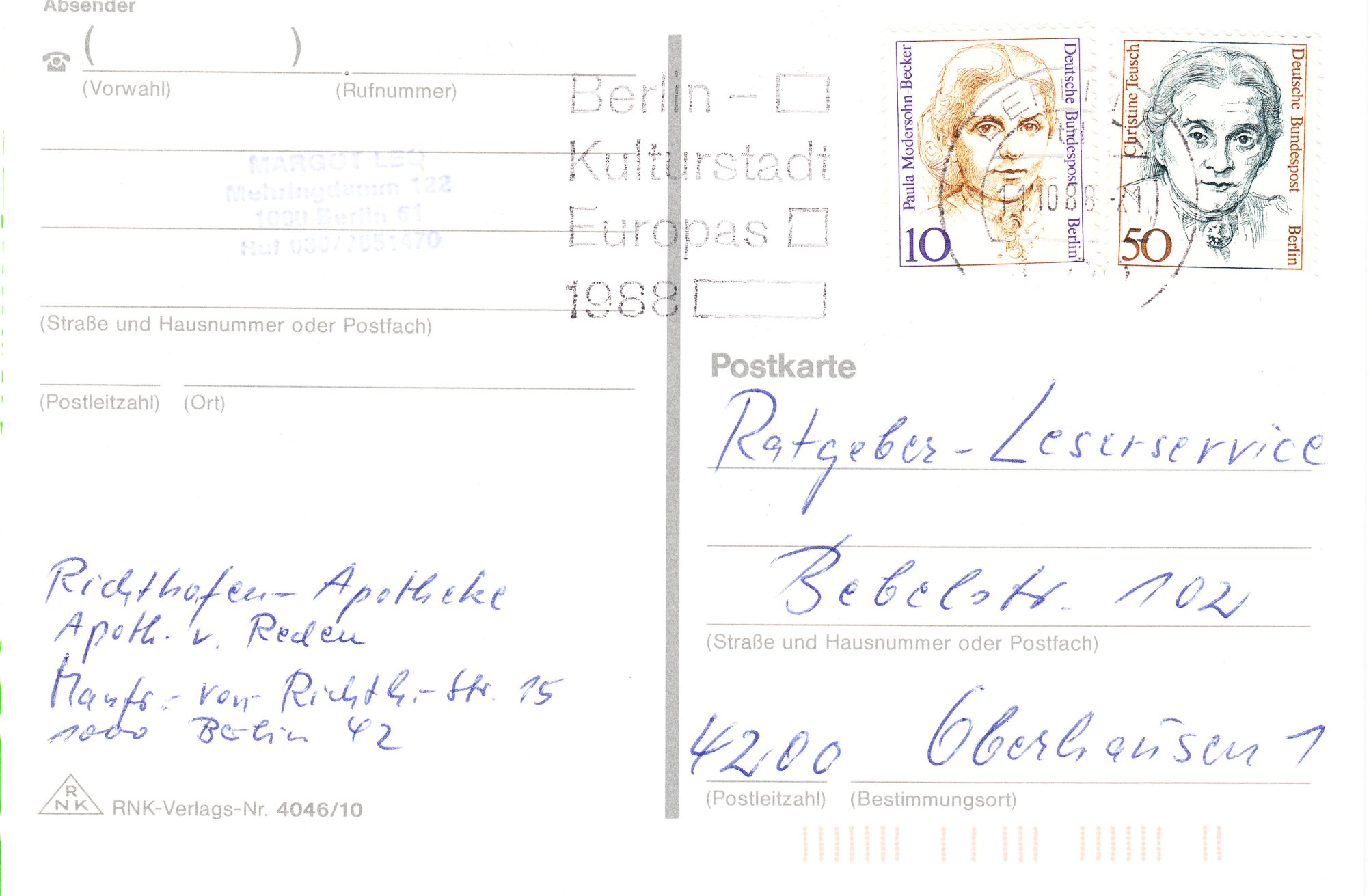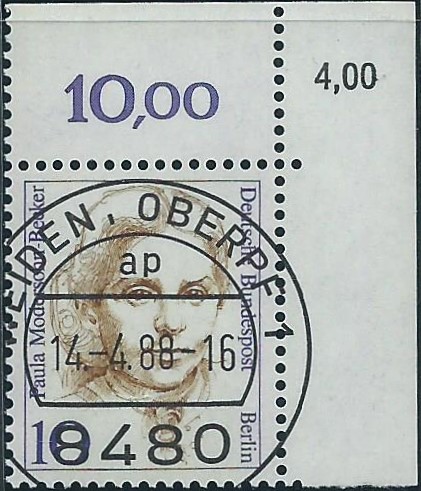 hier kann ich eine Marke der Serie „Frauen“ zu 10 Pf zeigen, die aus der rechten oberen Bogenecke stammt. Gestempelt wurde mit dem Klischeestempel Weiden am 14.4.88. In der äußeren Ecke ist noch der korrigierte Bogenwertzähler 4,00 mit aufgedruckt.