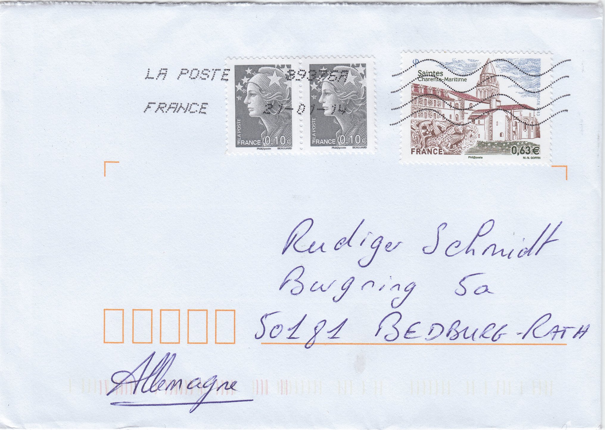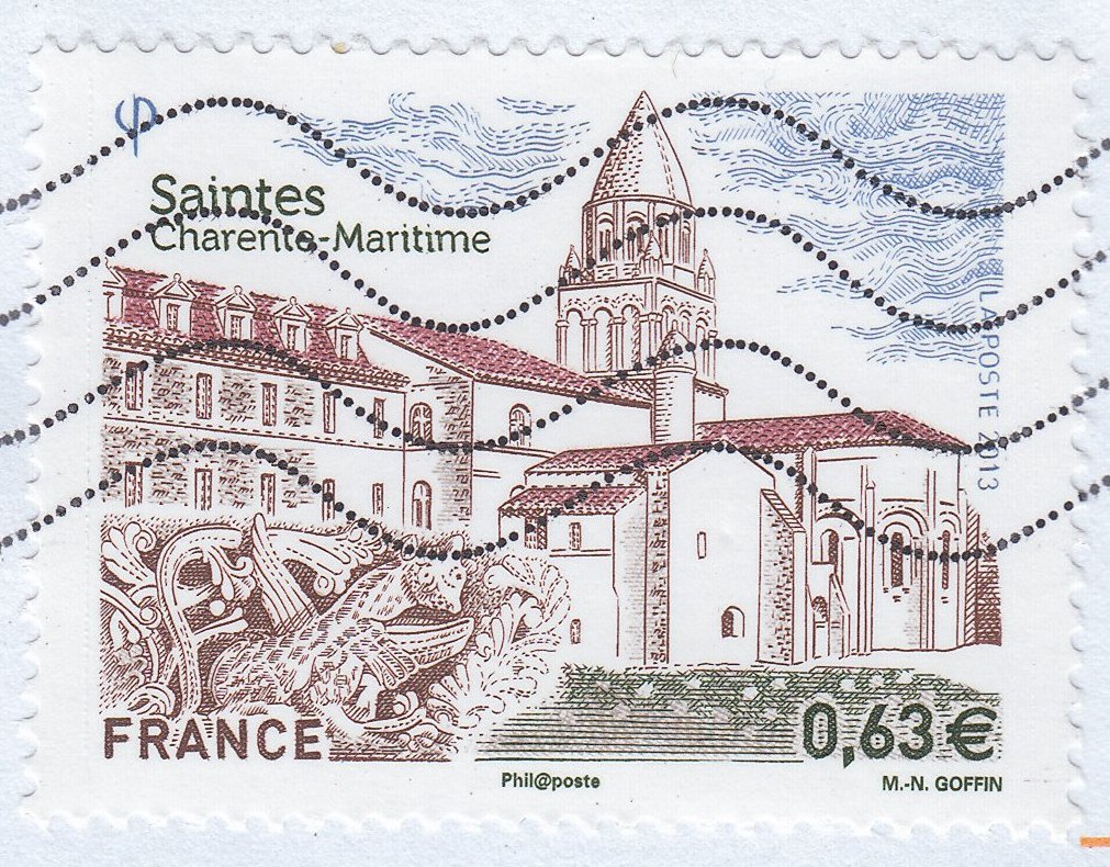 Auf dieser französischen Briefmarke ist links unten ein Detail des zweiten Bogens des Hauptportals der l’Abbaye-aux-Dames in Saintes, Charente-Maritime dargestellt, das einen Flügelstier, das Evangelistensymbol des Lukas darstellt: