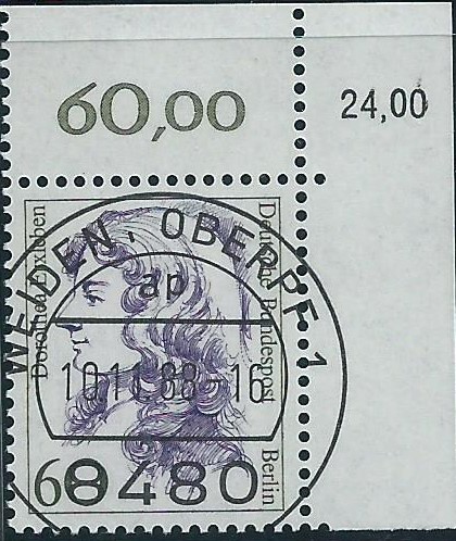 hier kann ich eine Marke der Serie „Frauen“ zu 60 Pf zeigen, die aus der rechten oberen Bogenecke stammt. Gestempelt wurde mit dem Klischeestempel Weiden am 10.11.88. In der äußeren Ecke ist noch der korrigierte Bogenwertzähler 24,00 mit aufgedruckt.