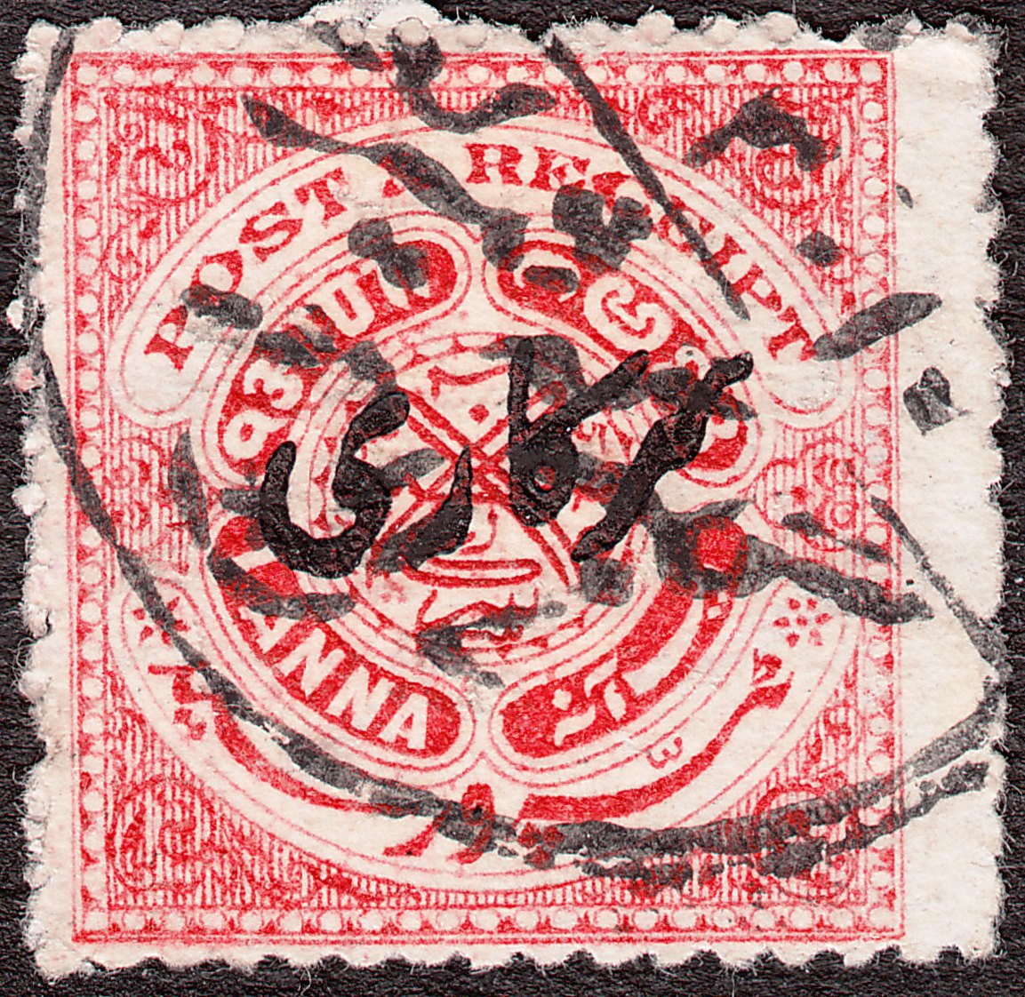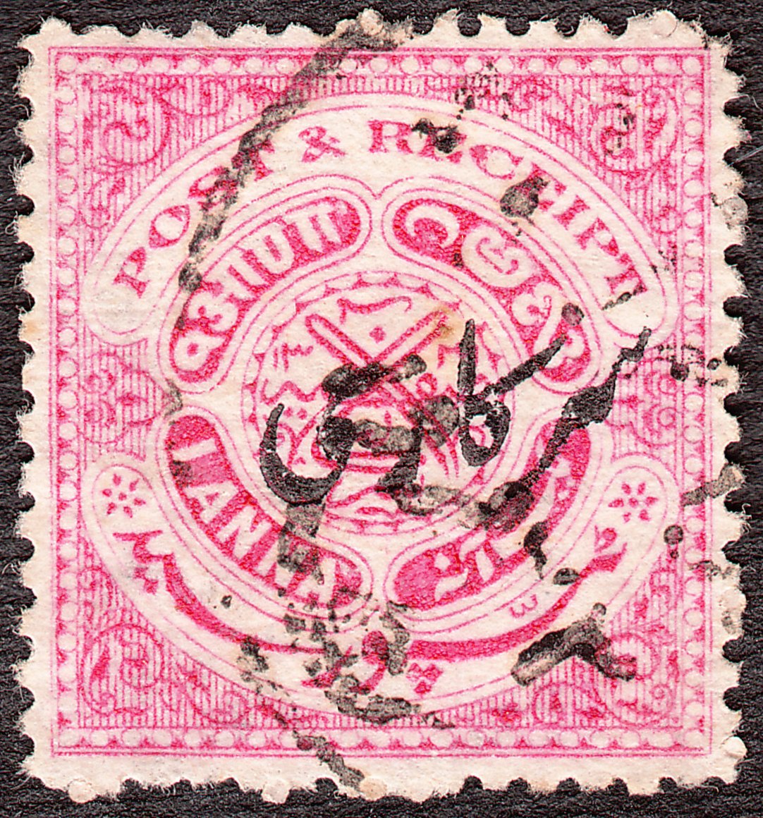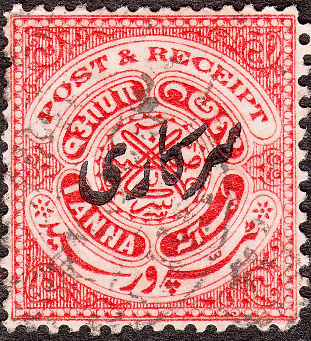 Die Freimarke MiNr. 24 zu 1 Anna in Karmin mit Inschrift "POST & RECEIPT" wurde mit Aufdruck "Sarkari" = Dienst in Type versehen 1917 als Dienstmarke MiNr. D 31 ausgegeben: