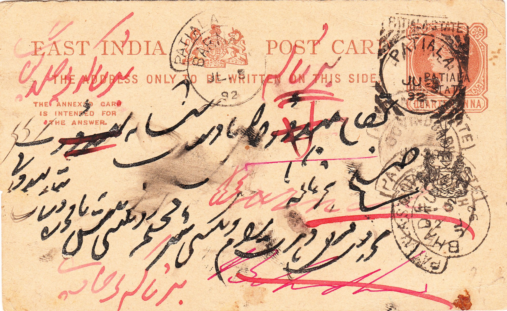 Foren-Übersicht Fragen und Diskussion Übersee Asien Indien Vertragsstaaten und Feudalstaaten Patiala Postkarte Indien QUARTER ANNA mit Aufdruck