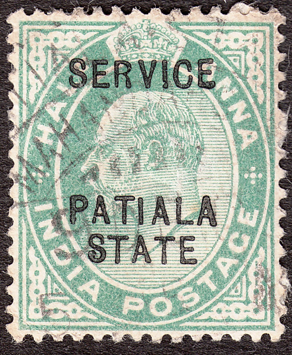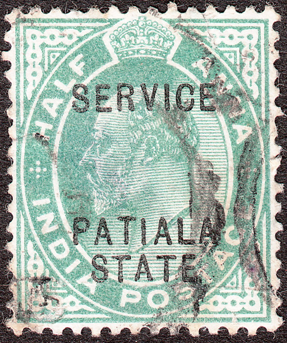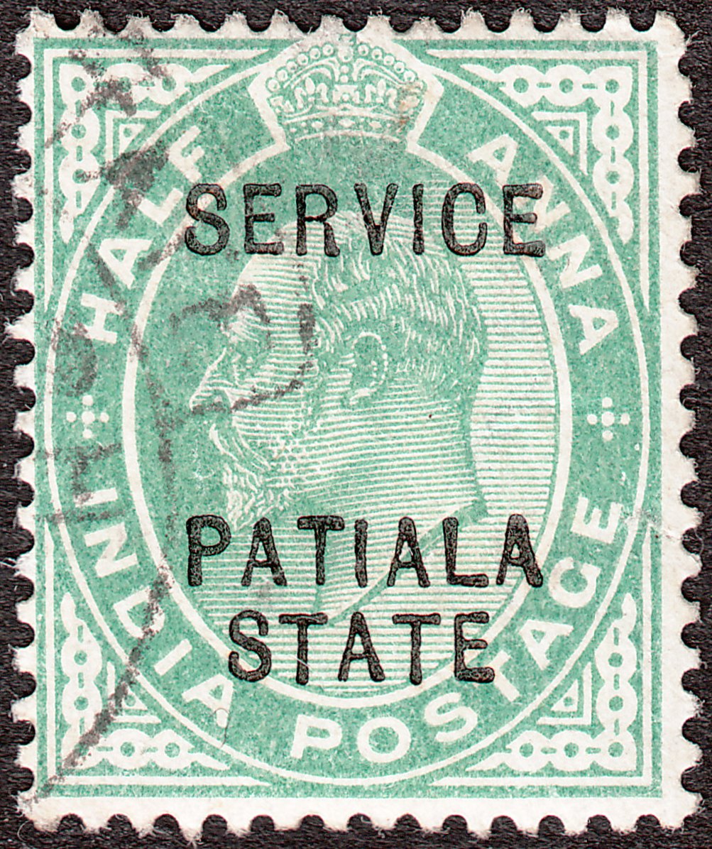Als Patiala Dienstmarke MiNr. D 20 erschien die Freimarke Indien MiNr. 56 mit der Inschrift "HALF ANNA INDIA POSTAGE" und schwarzem Aufdruck "SERVICE" oben und "PATIALA STATE" unten: