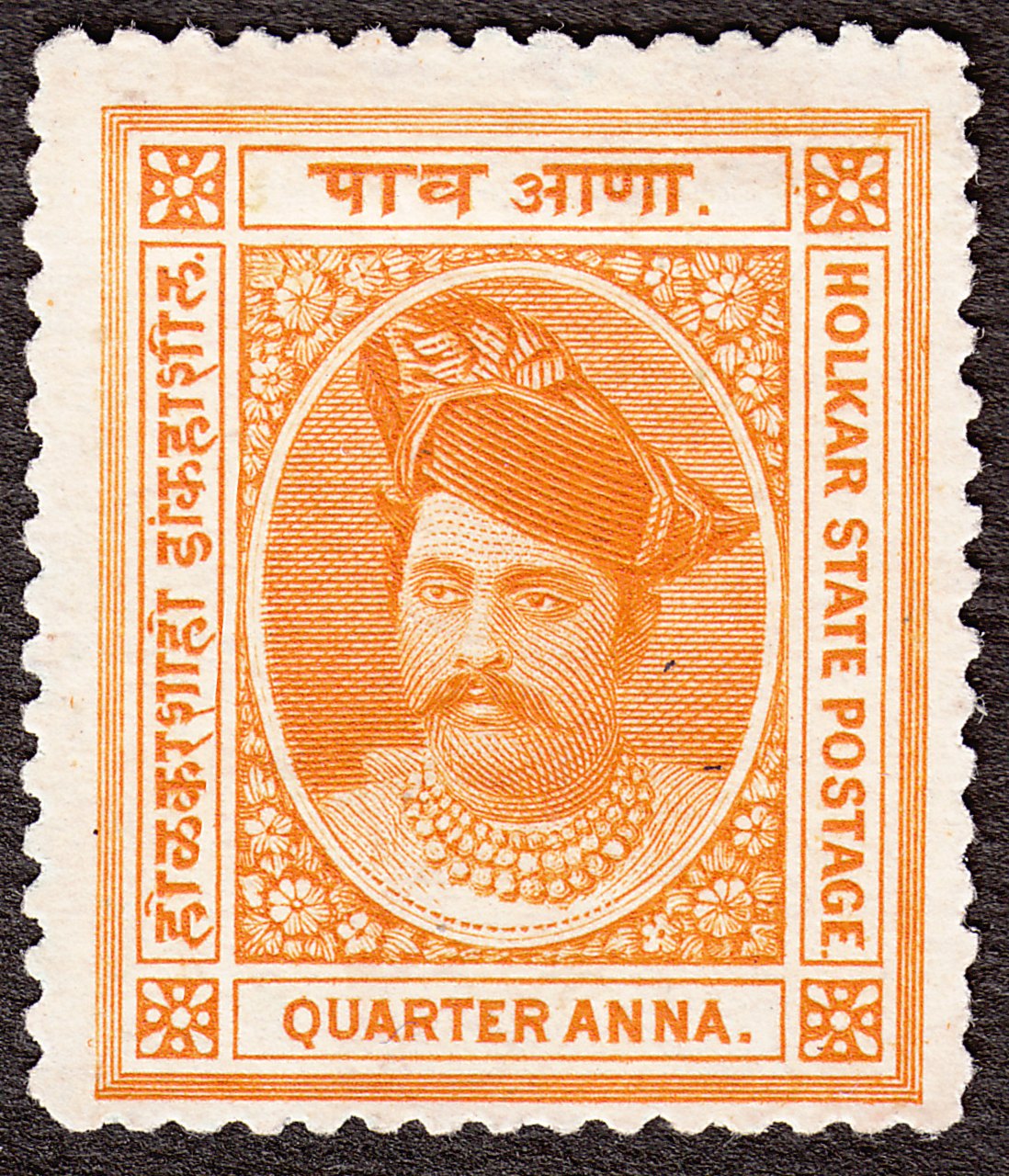 Diese als Indore MiNr. 4 katalogisierte Freimarke zu 1/4 Anna in orange mit dem Kopfbild von Maharadscha Schiwadschi Rao Holkar erschien 1892:
