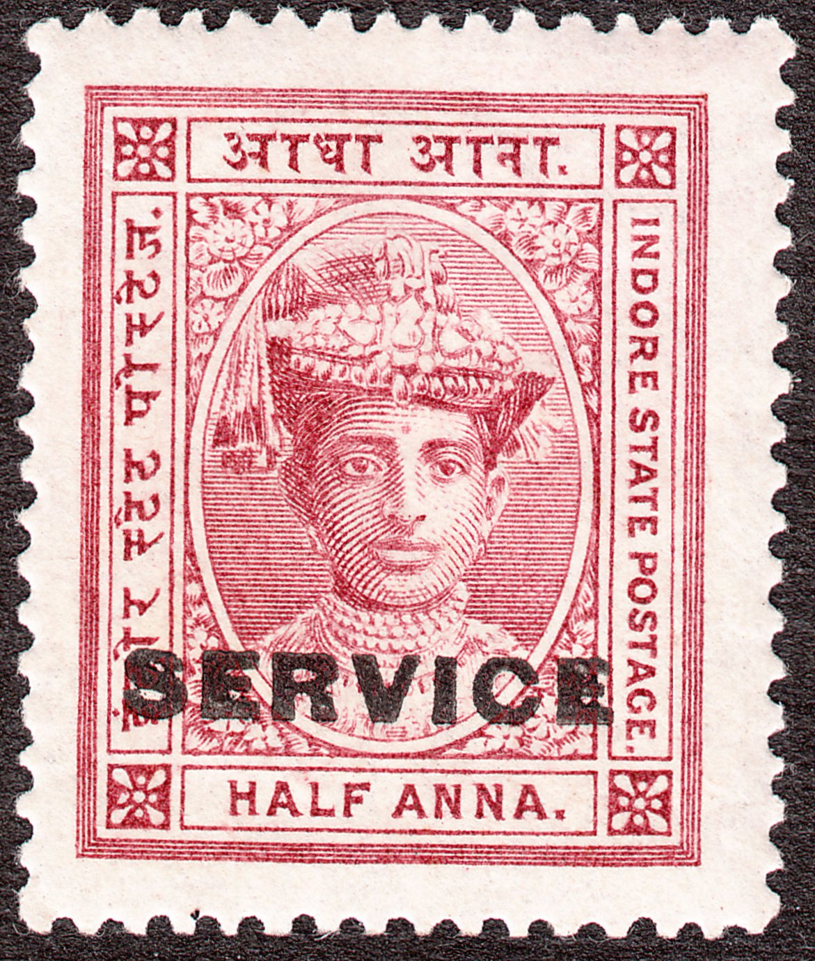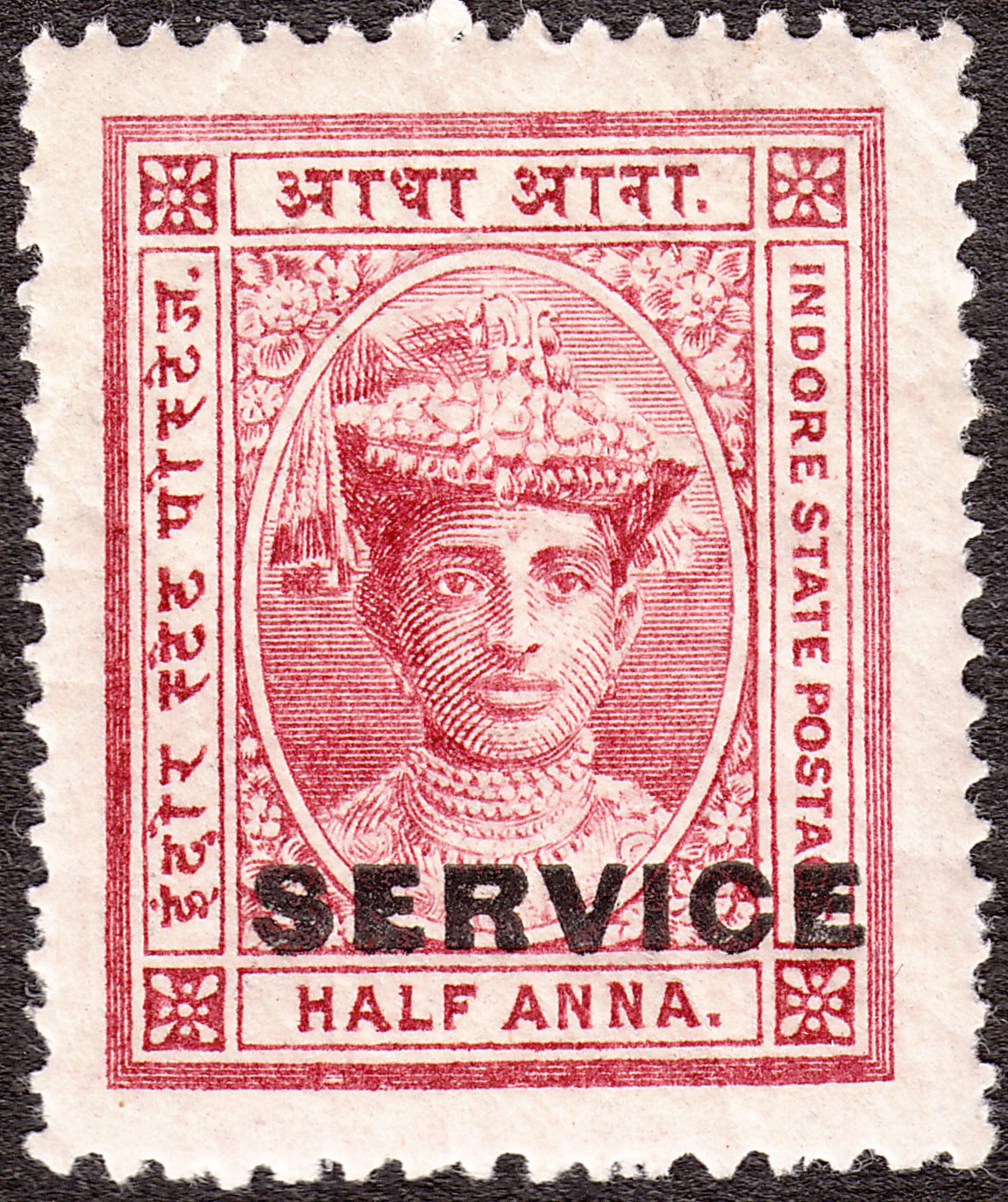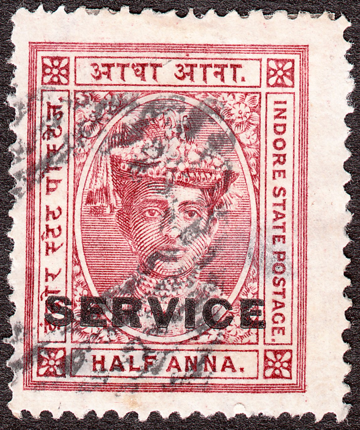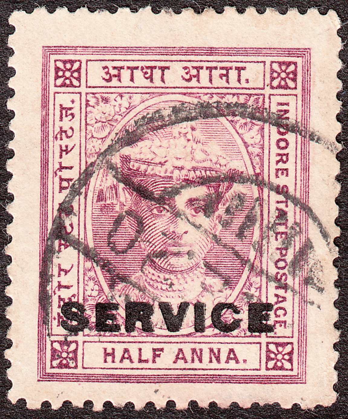 Die Freimarke Indore MiNr. 8 wurde mit schwarzem Aufdruck "SERVICE" versehen als Indore Dienstmarke MiNr. D 2 ausgegeben: