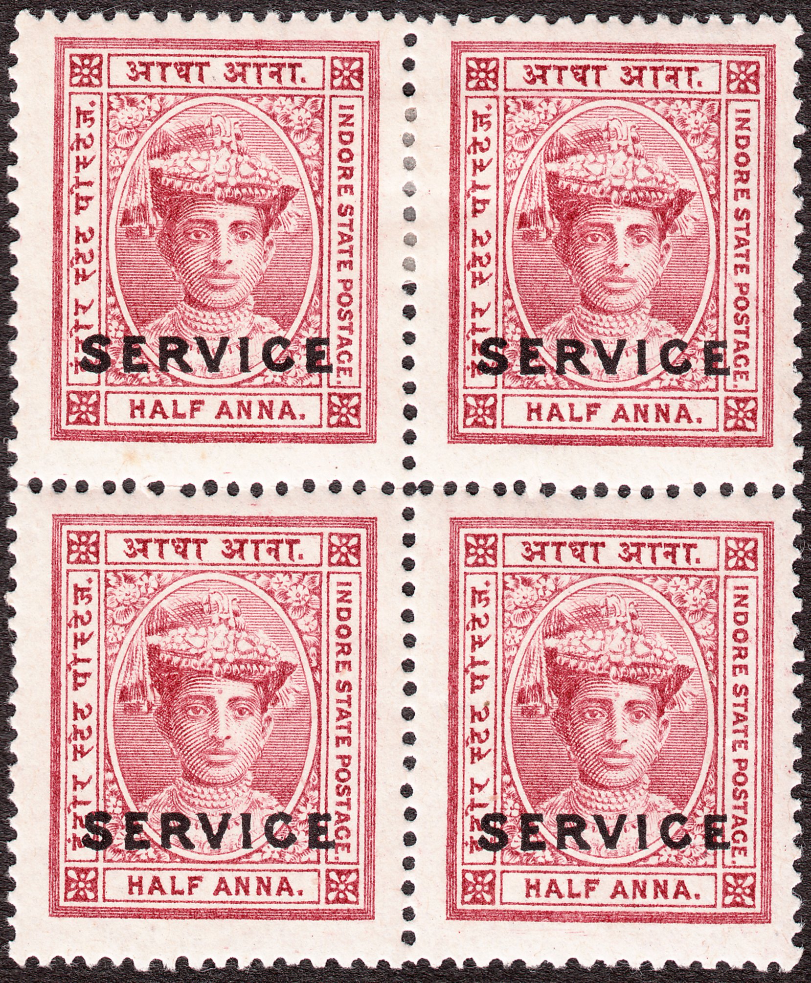 Hier im Viererblock die Freimarke Indore MiNr. 8 mit schwarzem Aufdruck "SERVICE" in dünneren Buchstaben, ausgegeben als Indore Dienstmarke MiNr. D 2 II: