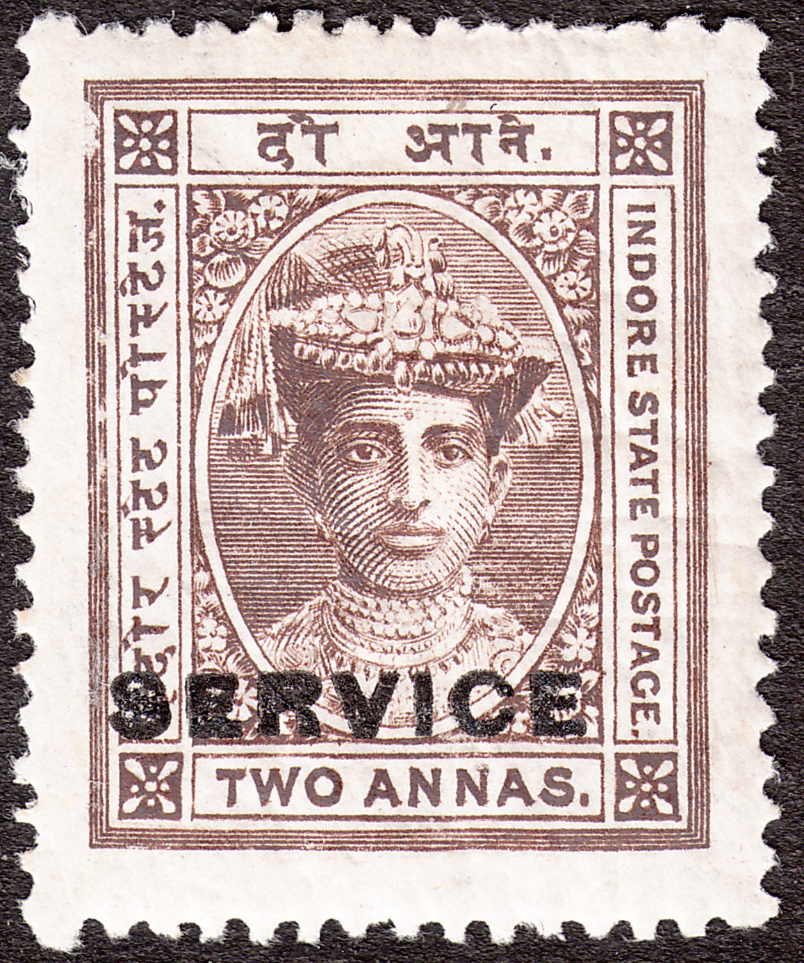 Die Freimarke Indore MiNr. 10 zu 2 Annas in braun wurde mit schwarzem Aufdruck "SERVICE" versehen als Indore Dienstmarke MiNr. D 4 ausgegeben:
