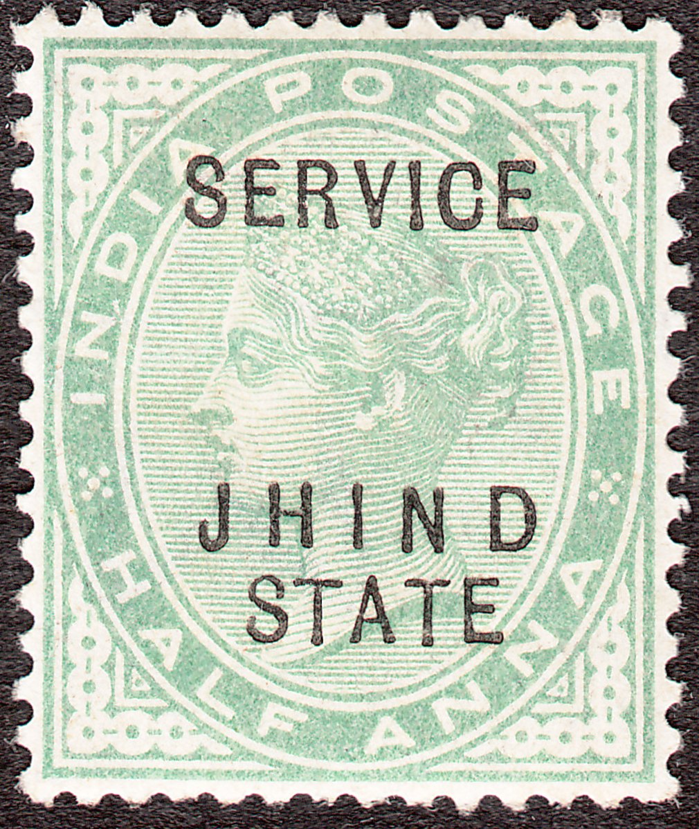 Die Freimarke Indien MiNr. 51 wurde mit zweizeiligem schwarzem Aufdruck "JHIND STATE" versehen als Freimarke Jind MiNr. 30 ausgegeben. Diese wiederum wurde mit einem weiteren schwarzen Aufdruck waagerecht "SERVICE" versehen und erschien 1902 als Dienstmarke Jind MiNr. D 9: