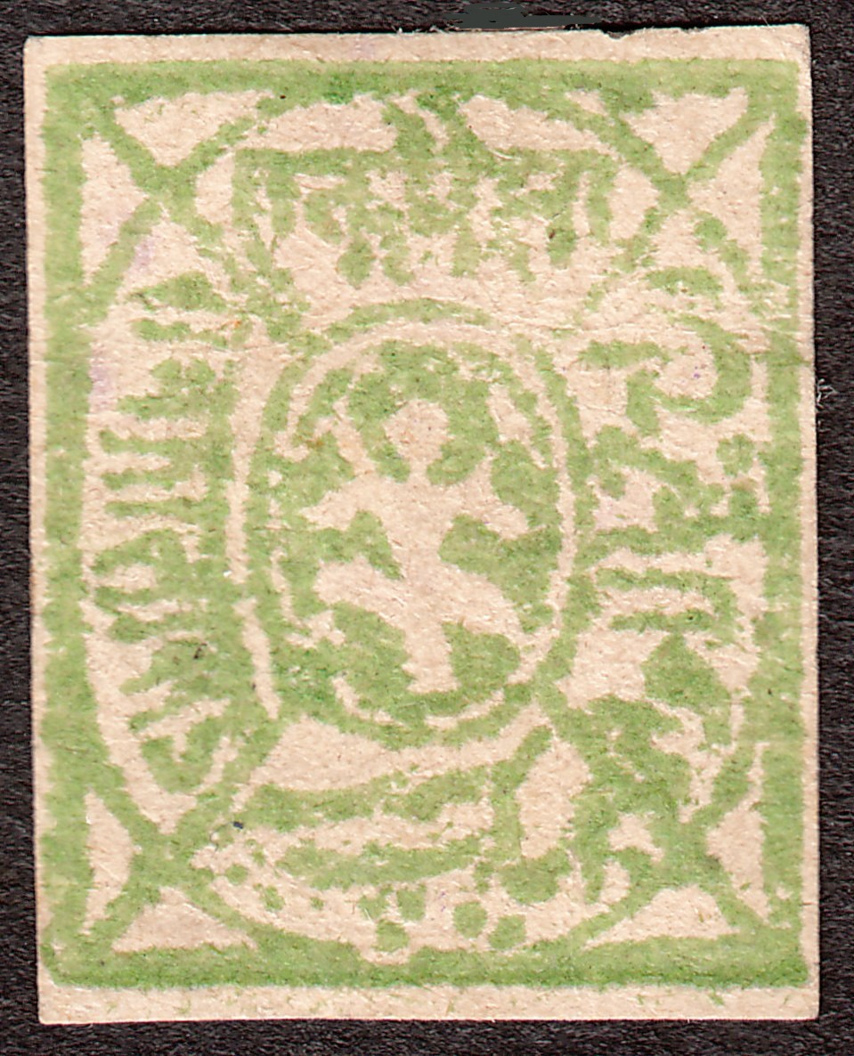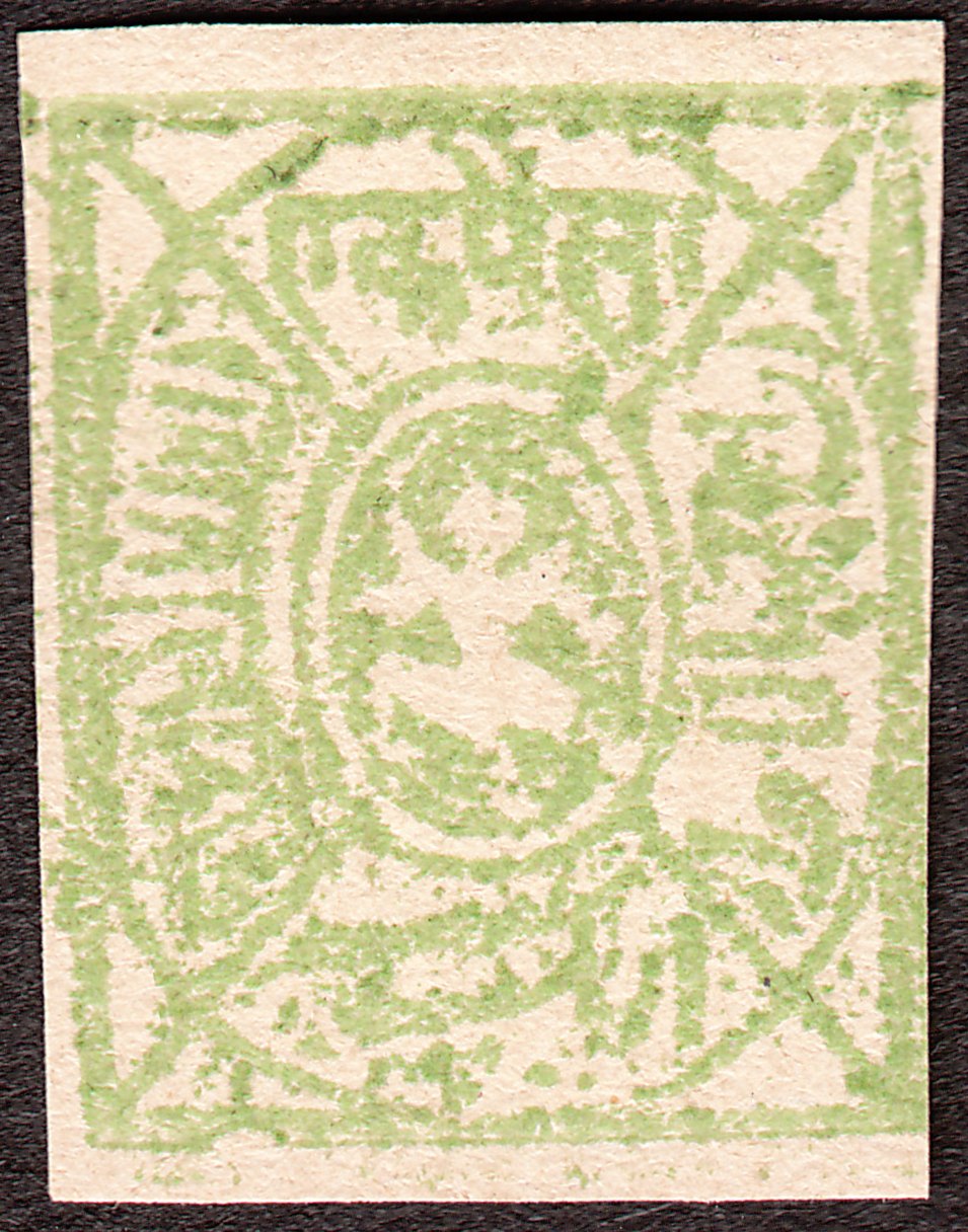 Diese in Jhalawar 1887 erschienene Freimarke zu 1 Paisa in grün wurde als MiNr. 1 katalogisiert: