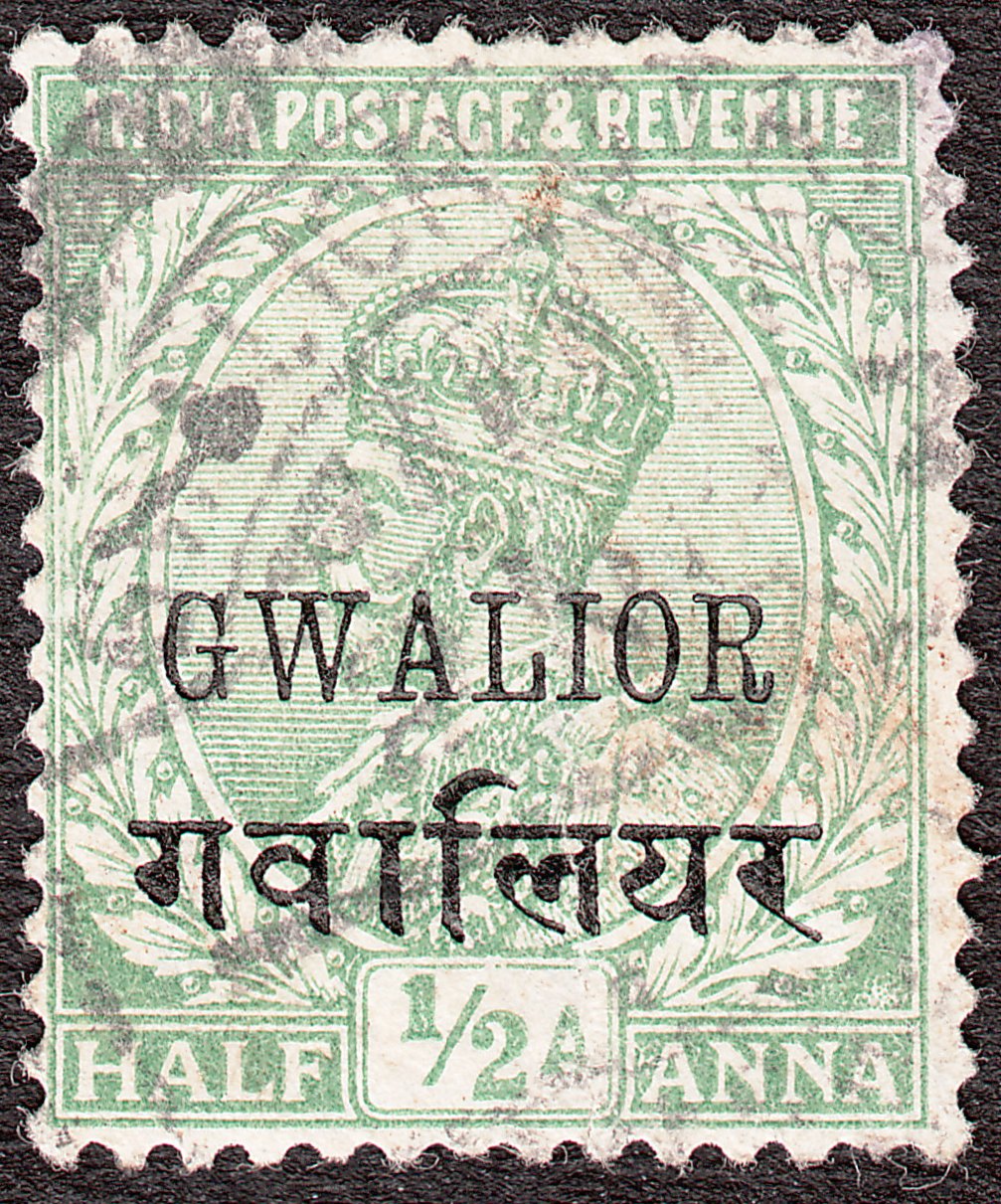 Die Freimarke Indien MiNr. 101 wurde 1930 mit einem zweizeiligen schwarzen Aufdruck in Devangari und Englisch versehen "GWALIOR" als Gwalior MiNr. 52 ausgegeben: