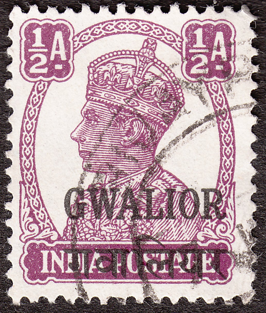 Die Freimarke Indien MiNr. 166 zu 1/2 Anna in purpur wurde mit schwarzem Aufdruck versehen am 20.05.1943 ausgegeben als Gwalior MiNr. 103: