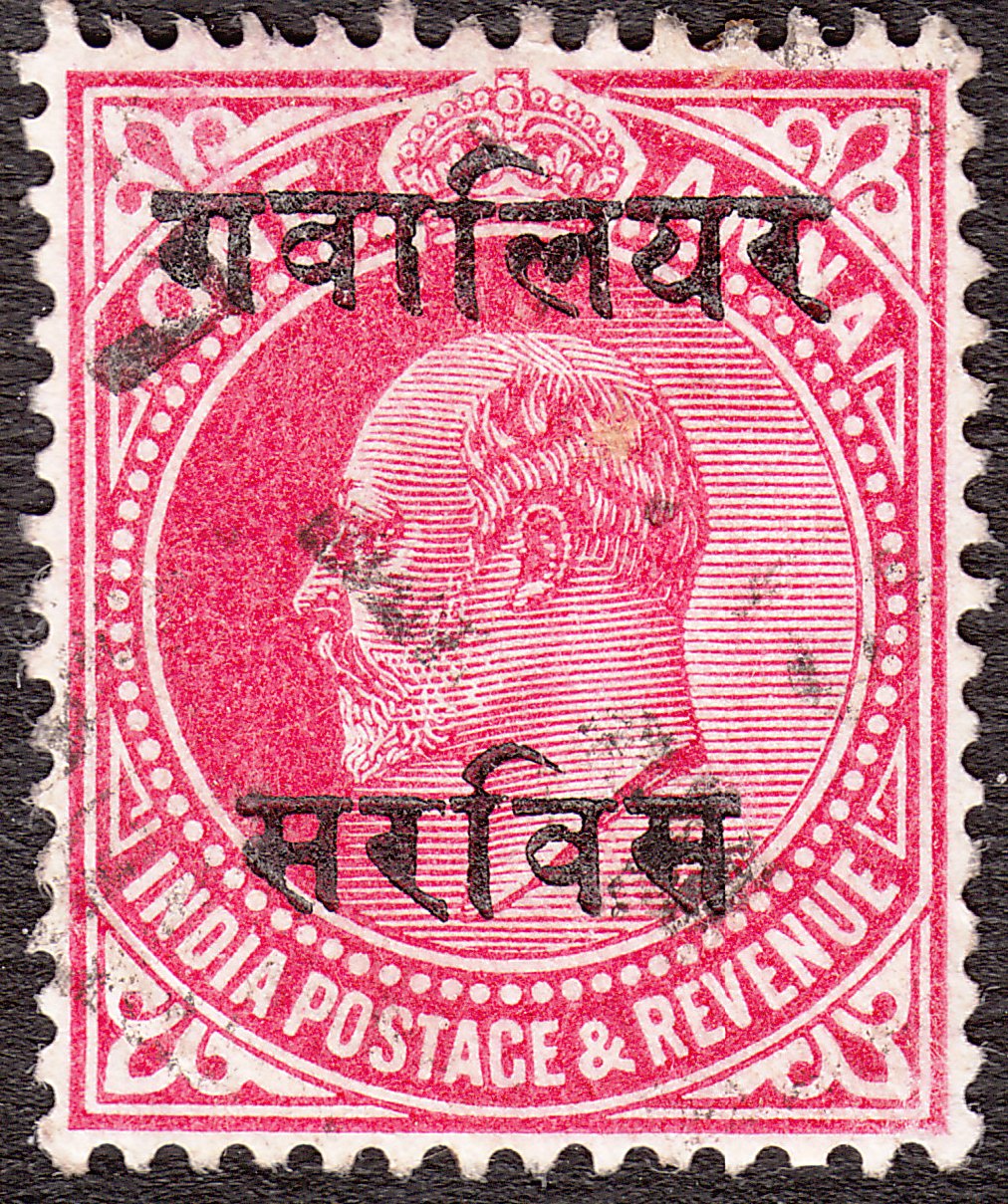 Die Freimarke Indien MiNr. 71 erschien 1907 in Gwalior mit zweizeiligem Aufdruck in Devanagari-Schrift, oben Gwalior, unten Sarvis = Dienst. Der Aufdruckabstand beträgt hier 10 mm, katalogisiert als Gwalior MiNr. D 20 I: