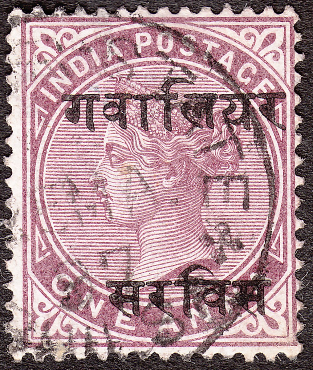Gwalior versah 1895 die Freimarke Indien MiNr. 33 mit einem zweizeiligen schwarzen Aufdruck in Devanagari-Schrift, oben steht Gwalior, unten Sarvis = Dienst: