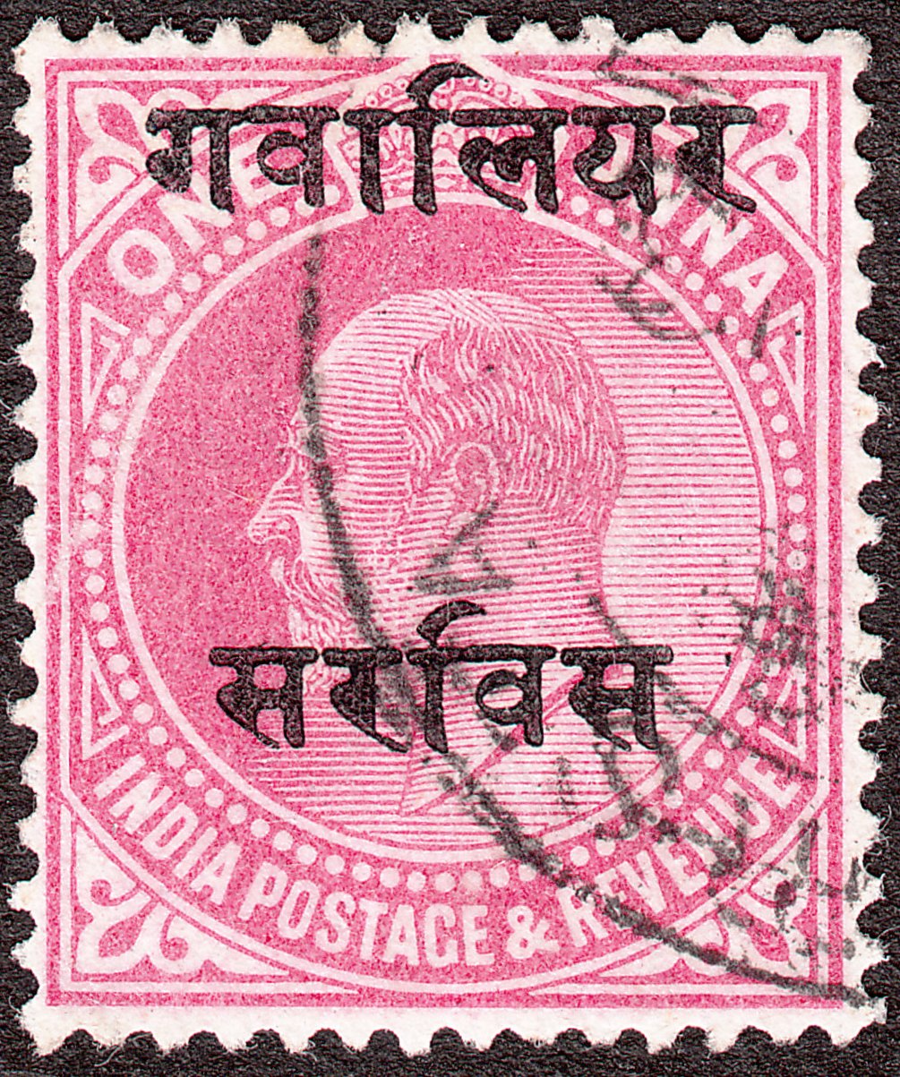 Die Freimarke Indien MiNr. 71 erschien 1907 in Gwalior mit zweizeiligem Aufdruck in Devanagari-Schrift, oben Gwalior, unten Sarvis = Dienst. Der Aufdruckabstand beträgt hier 10 mm, katalogisiert als Gwalior MiNr. D 20 I: