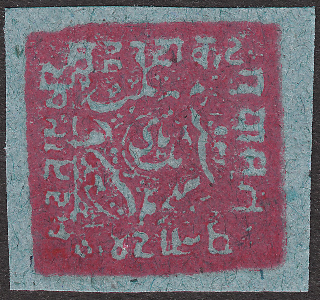 Im Feudalstaat Punch erschien 1885 diese Freimarkenausgabe als Handstempel auf verschiedenfarbigen Papieren mit Inschriften in Devanagari-Schrift sowie in persischer Schrift, hier ein Exemplar auf Papier der Farbe weiß, katalogisiert als MiNr. 7 a: