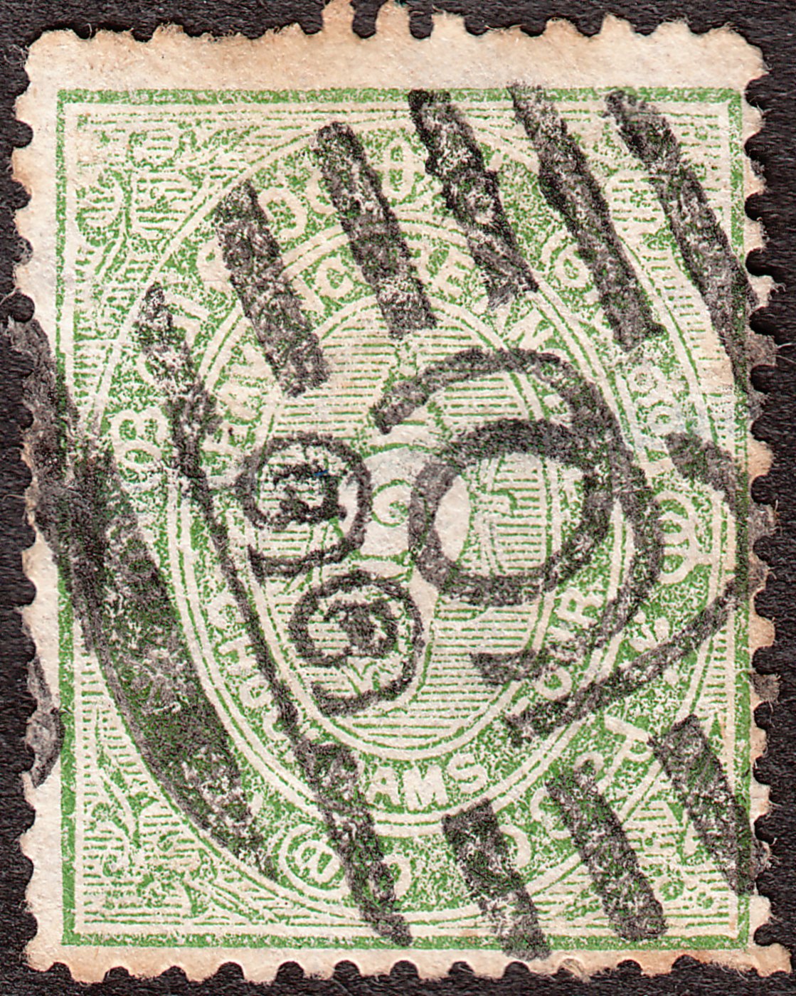 Diese Freimarke zu 4 Chukrams in grün auf einfachem, nicht gestreiftem Papier ist katalogisiert als MiNr. 8:
