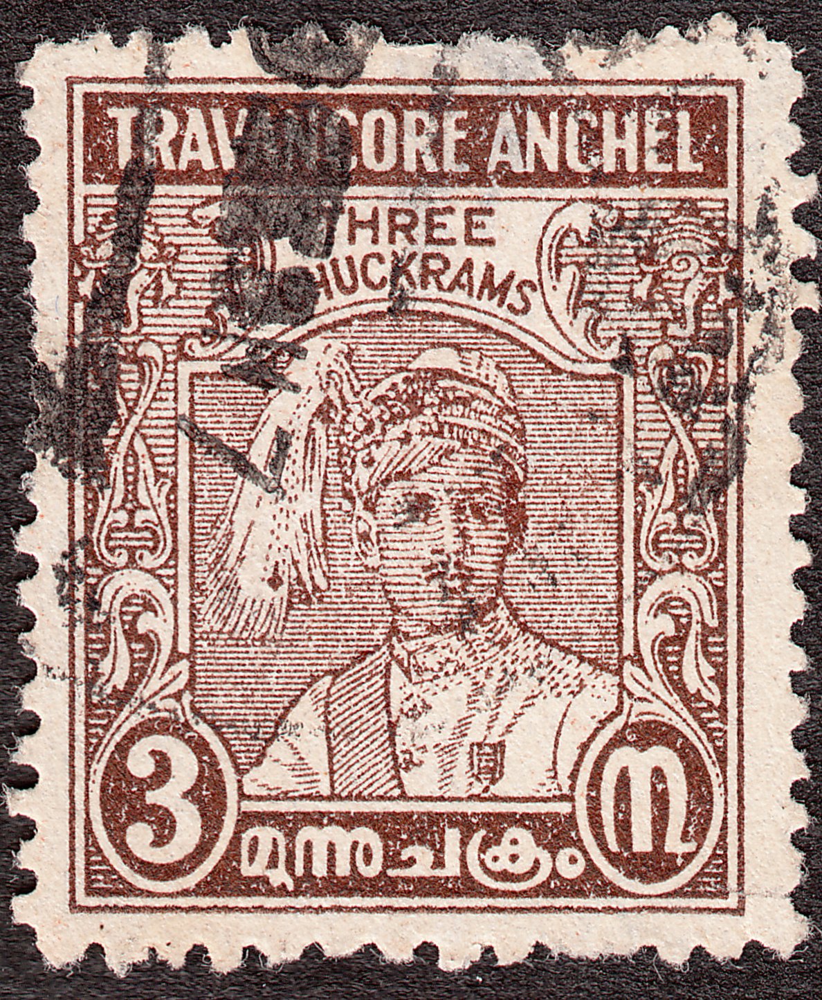 Diese Sonderausgabe zu 3 Chukrams in braun erschien am 09.11.1939 zum 27. Geburtstag des Maharadschas Sir Bala Rama Varma X. und zeigt den Maharadscha: