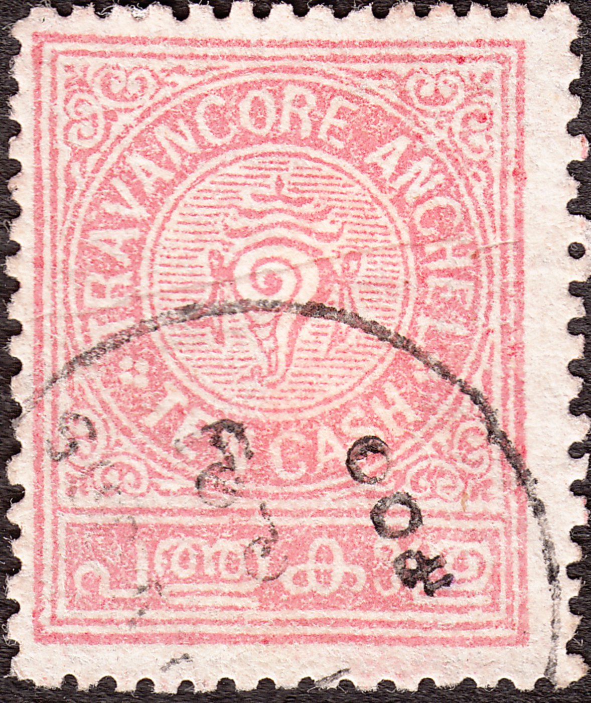 Diese Freimarke zu 10 Cash, katalogisiert als Travancore MiNr. 23, erschien 1921: