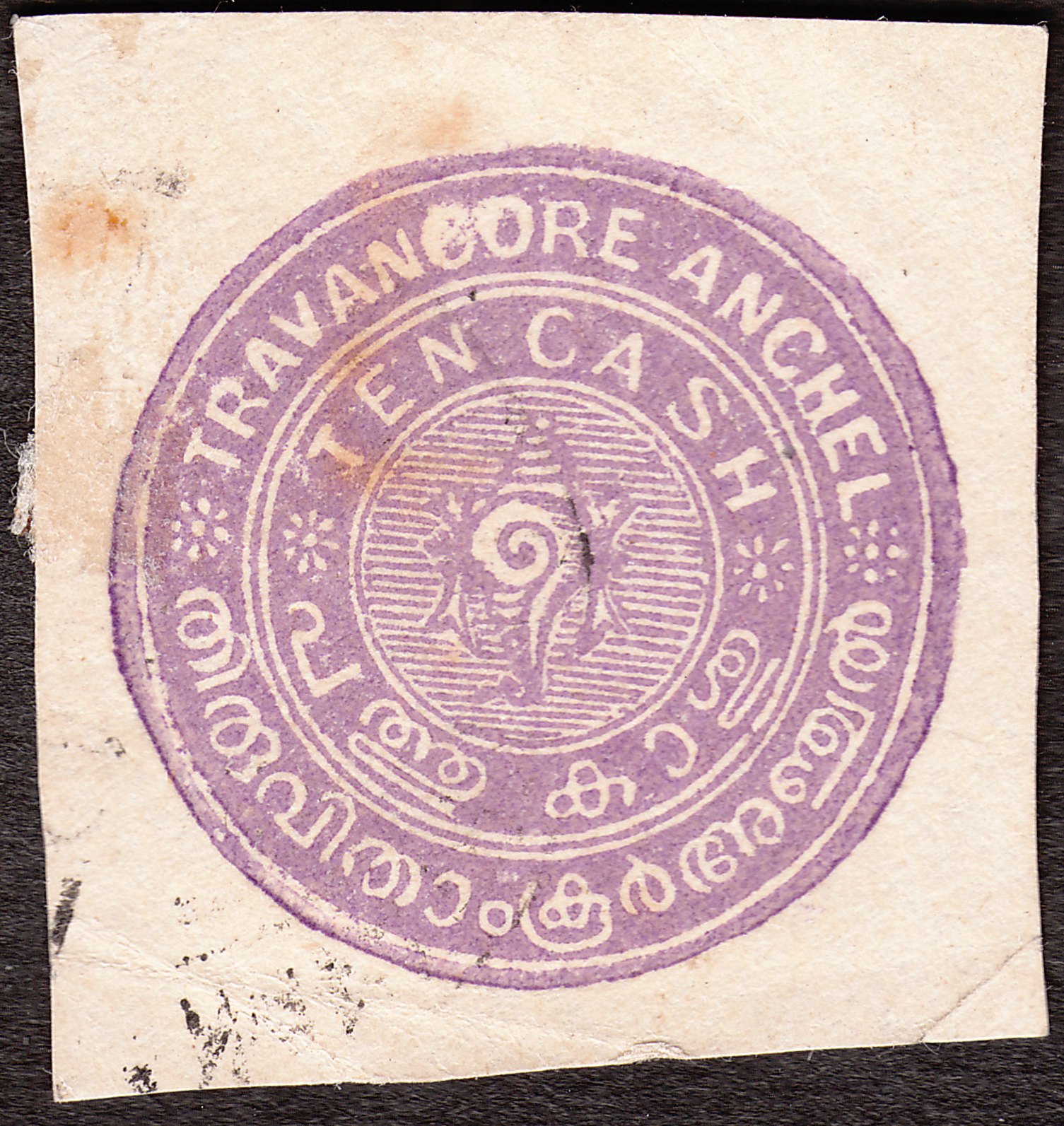Dieses auf von links oben nach rechts unten diagonal gestreiftem Papier gedruckte Exemplar sieht aus wie der Wertstempel einer Ganzsache aus Travancore: