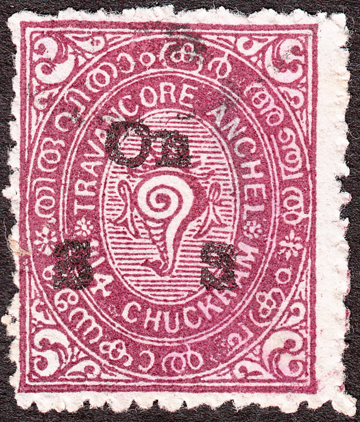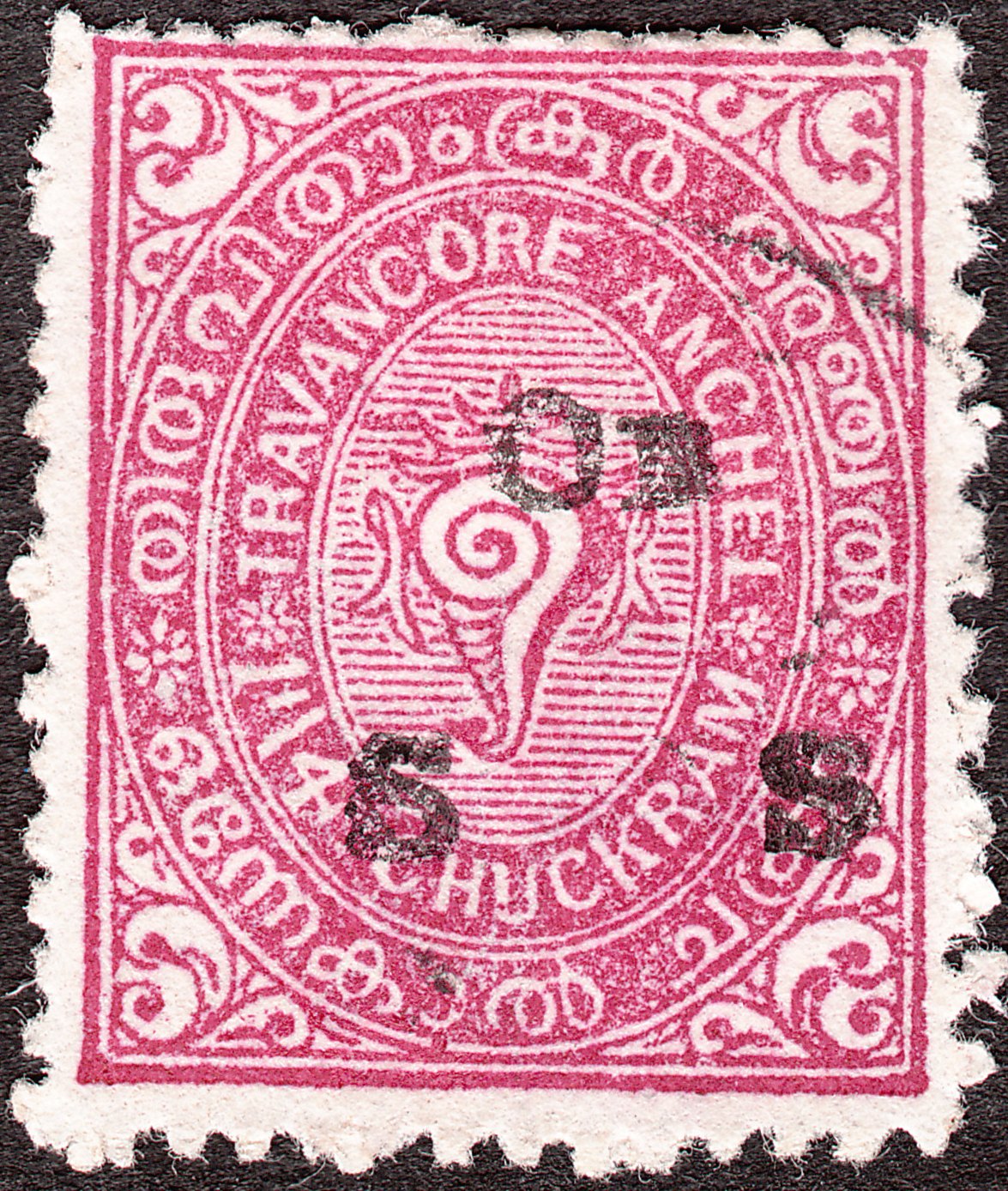Die Freimarke Travancore MiNr. 17 zu 1 1/4 Chukram wurde mit schwarzem Aufdruck "On S S" versehen als Dienstmarke Travancore MiNr. D 4 ausgegeben: