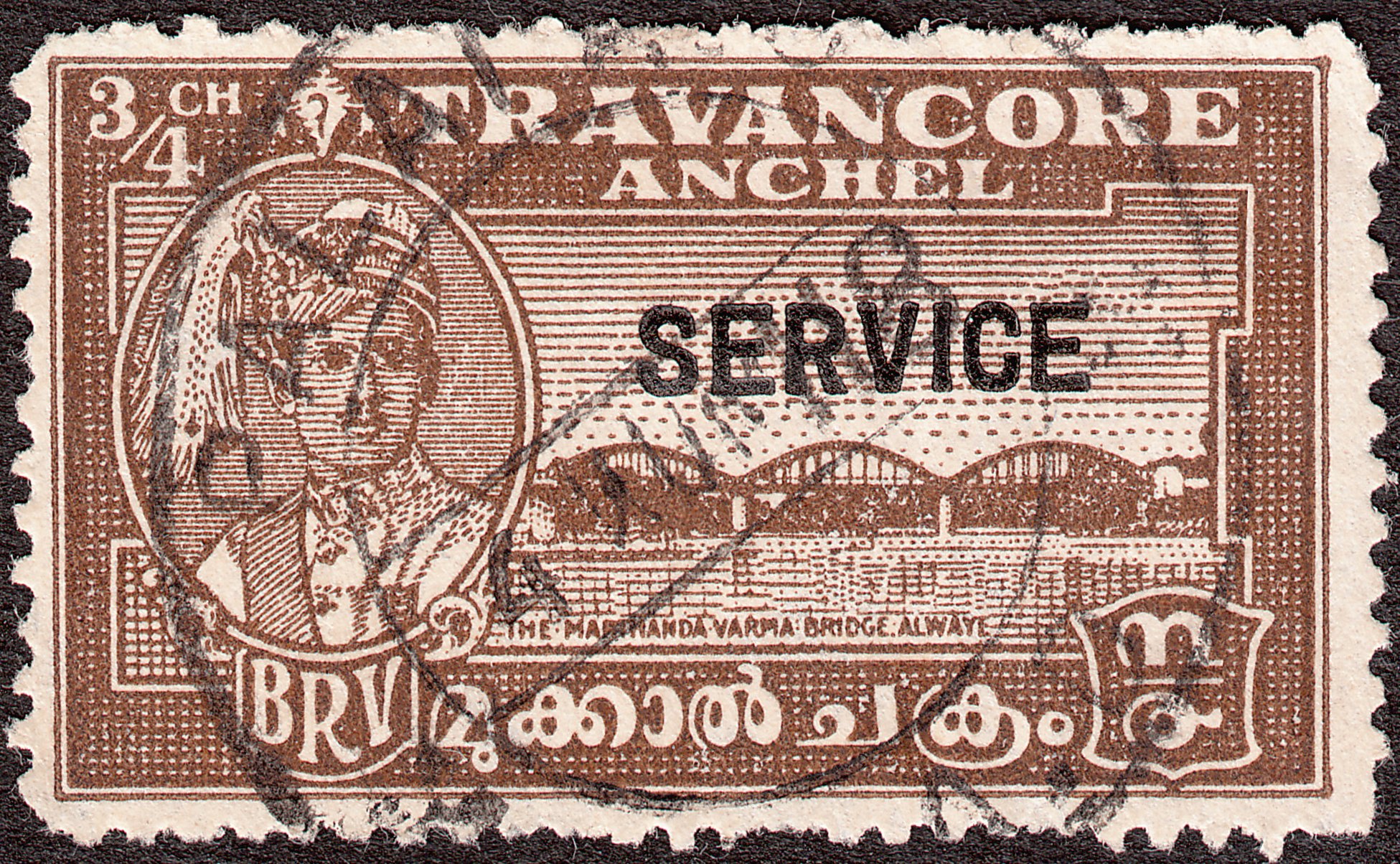 Die Freimarke Tranvancore MiNr. 45 wurde 1942 mit schwarzem Aufdruck "SERVICE" als Dienstmarke Tranvancore MiNr. D 44 ausgegeben: